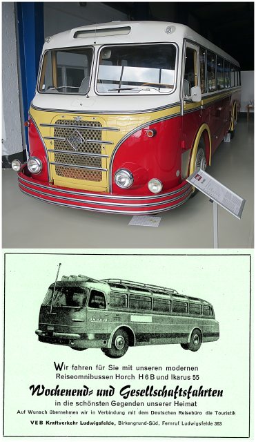 In Ludwigsfelde gibt es viele Angebote – so auch das Reisen in modernen Bussen. – Oben der H6B (Horch / 6t Nutzlast / Bus). Konstruiert bei Vomag und Horch. Produziert im Industrieverband Fahrzeugbau (IFA), in Werdau (Sachsen). Unten einer der Nachfolger: der „Ikarus 55-Luxusbus-Bus“ aus der befreundeten Volksrepublik Ungarn.