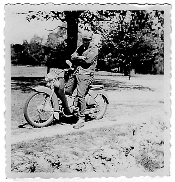 Chris mit seinem Simson-Moped-SR 1, einer Modifikation gegenüber dem Üblichen, im kleinen Dorf Großbeuthen, 1962.