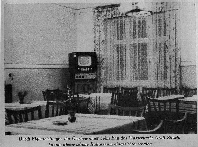 Einen derartigen Kulturraum hatte das Lehrlingswohnheim nicht. Technik und Mobiliar gelten jedoch als typische unbestechliche Zeitzeugen. Die Fernsehapparate dieser Zeit, so auch die Modelle „Rubens“ und „Rembrandt“ hatten ein sichtbares Bild von der Größe eines DIN-A4-Blattes (Diagonale 33 cm). Da wollte man schon gern einen Platz nahe der Mattscheibe ergattern. Ferngläser waren teurer.