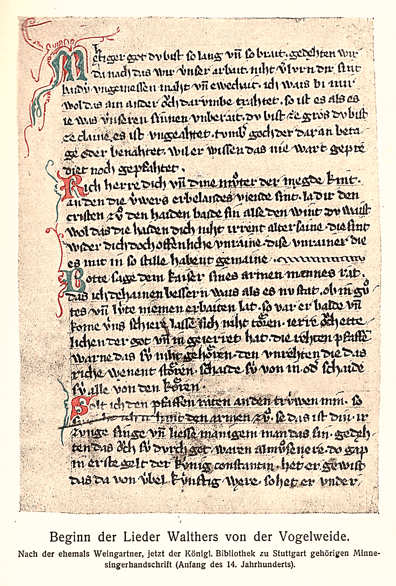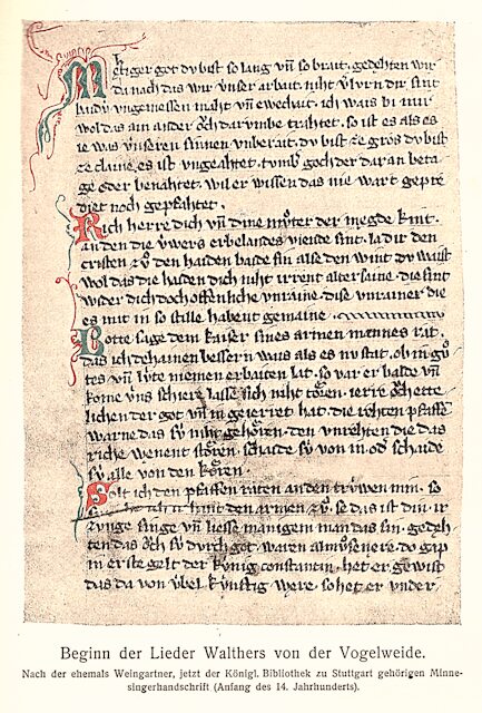 Nach dem großen Bilder- und Liederwerk „Manessische Handschrift“ aus dem 14. Jahrhundert. Standort: Universitätsbibliothek Heidelberg. Einen kleineren Auszug davon bietet die Insel-Bücherei, Band 450, Insel-Verlag in der DDR, höchst aktuell 1962.