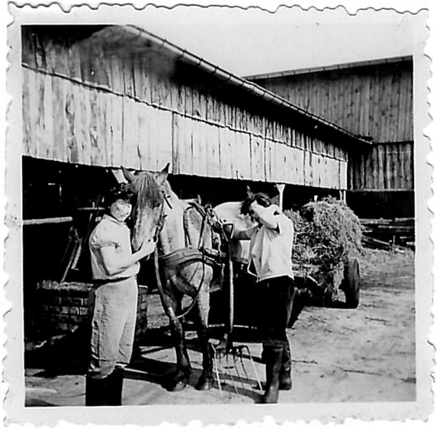 Der Charme der hübschen jungen Damen ist von mir wunschgemäß, wenn auch schmerzlich-widerwillig, unerkennbar verfremdelt worden. In der Mitte das Zugtier „Wallach Schimmel“. Lehrsatz: Liebe Lene, sage ich, lehne nie die Mistforke an das gute Tier, es könnte sich bedroht fühlen und zu Beaten aus- oder aber gänzlich ent-weichen.