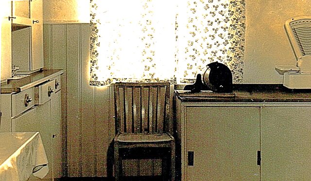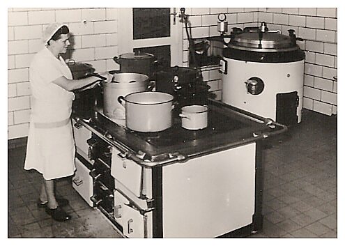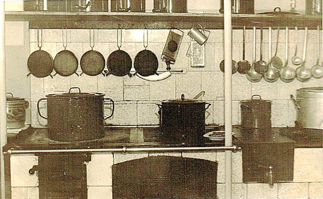 Am Herd steht unsere Köchin Marianne Lange. Die Tür, hinten mittig im Bild, führt in ihr geheimes Reich, in den Vorratsraum für die Lebensmittel und Speisezutaten.