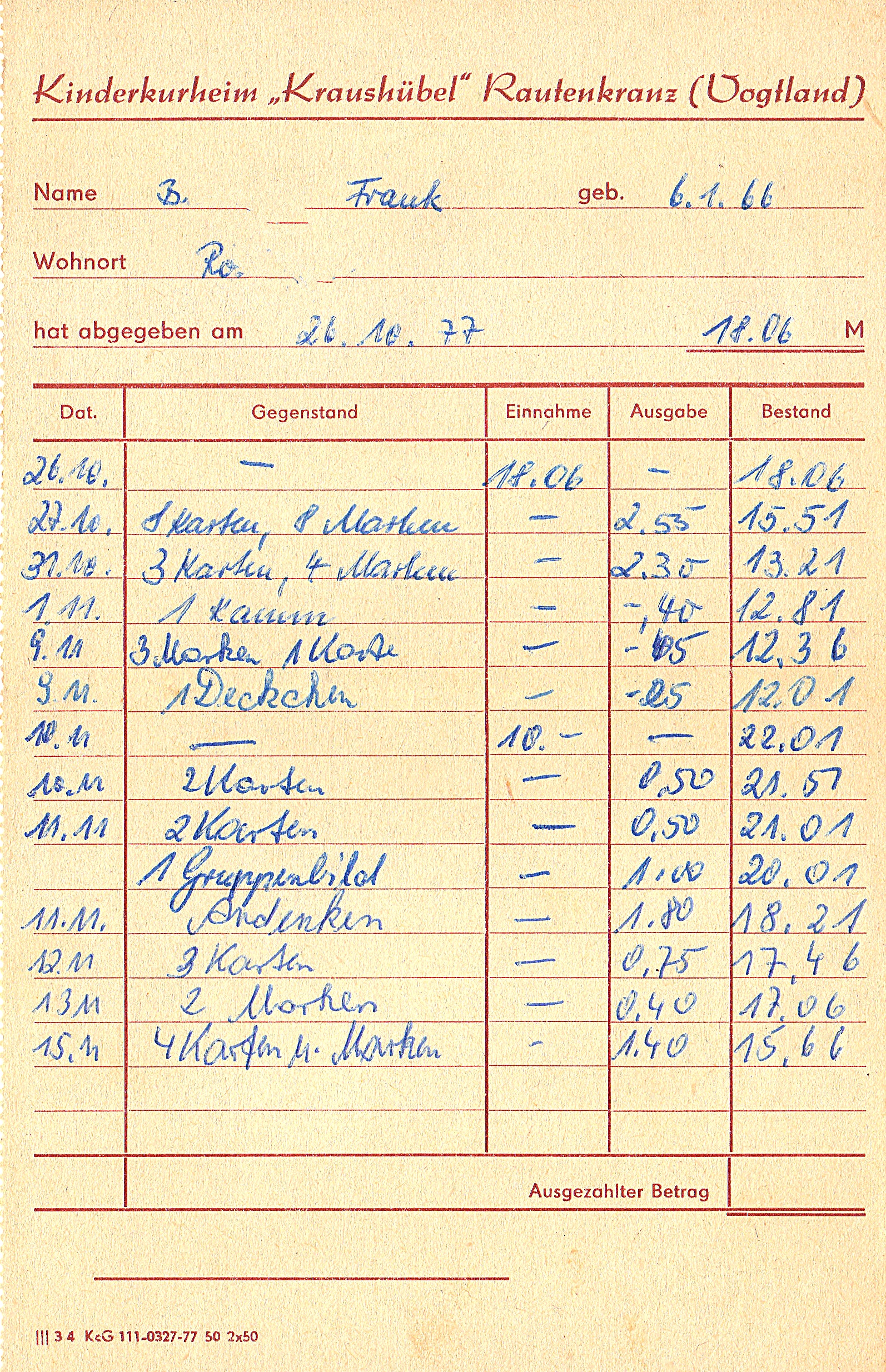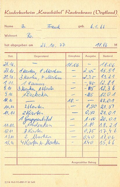 Hier zeigt uns Frank ausnahmsweise sein Bank-Konto – welche Finanzreichtümer er von zu Hause mitbrachte und wie zweckmäßig sowie sparsam er die wertvollen Mittel anlegte.