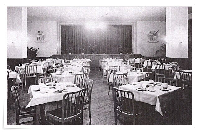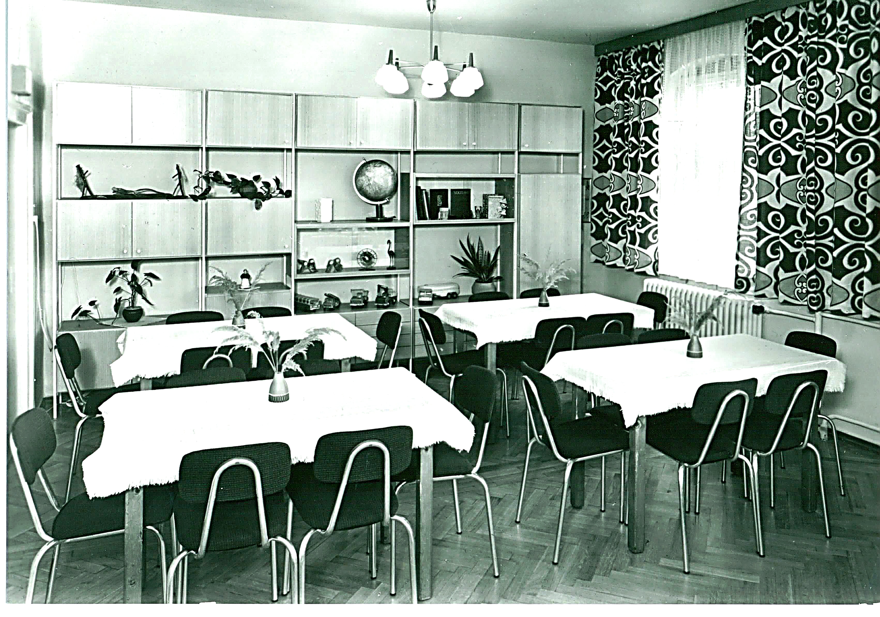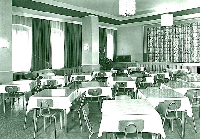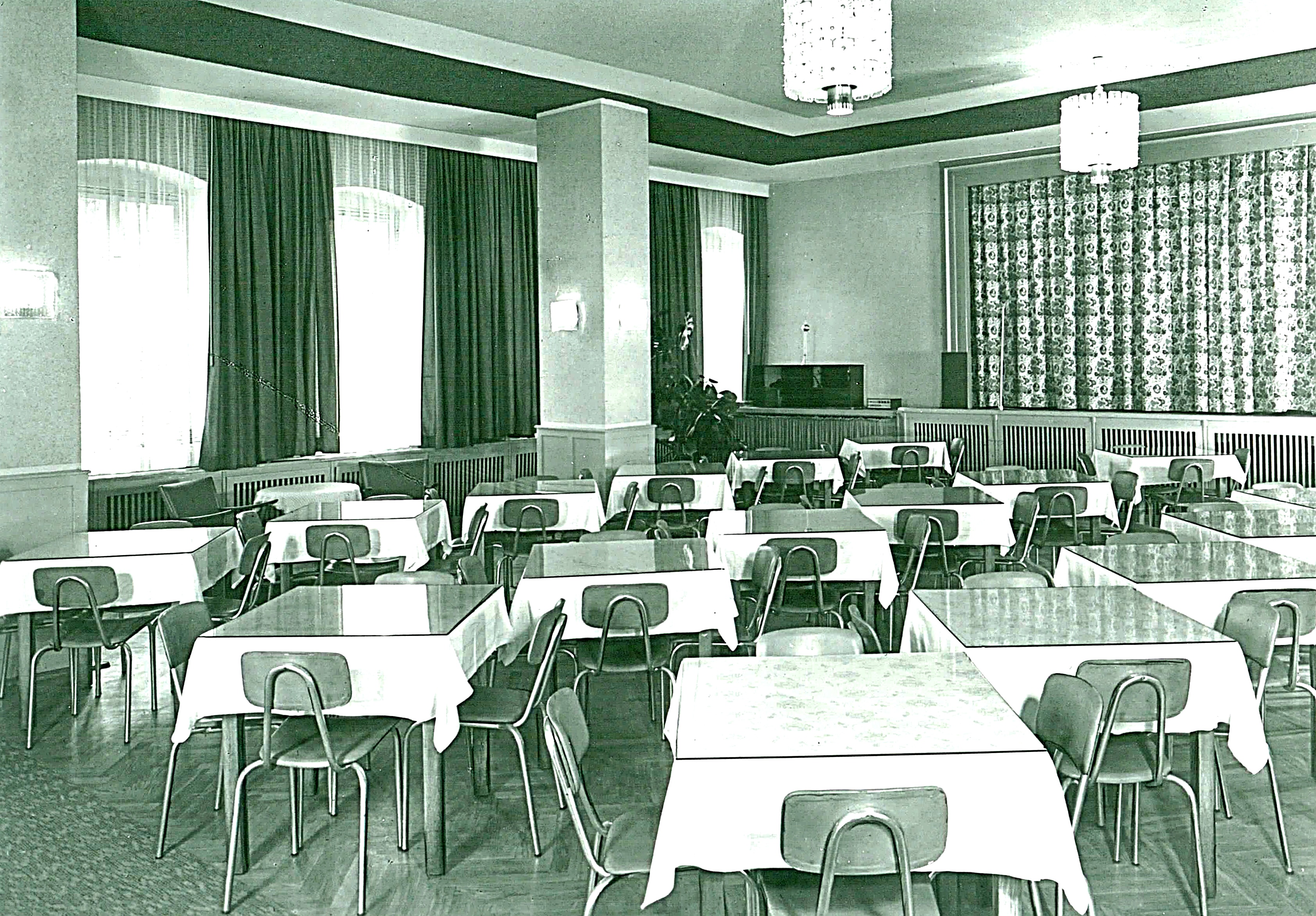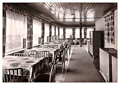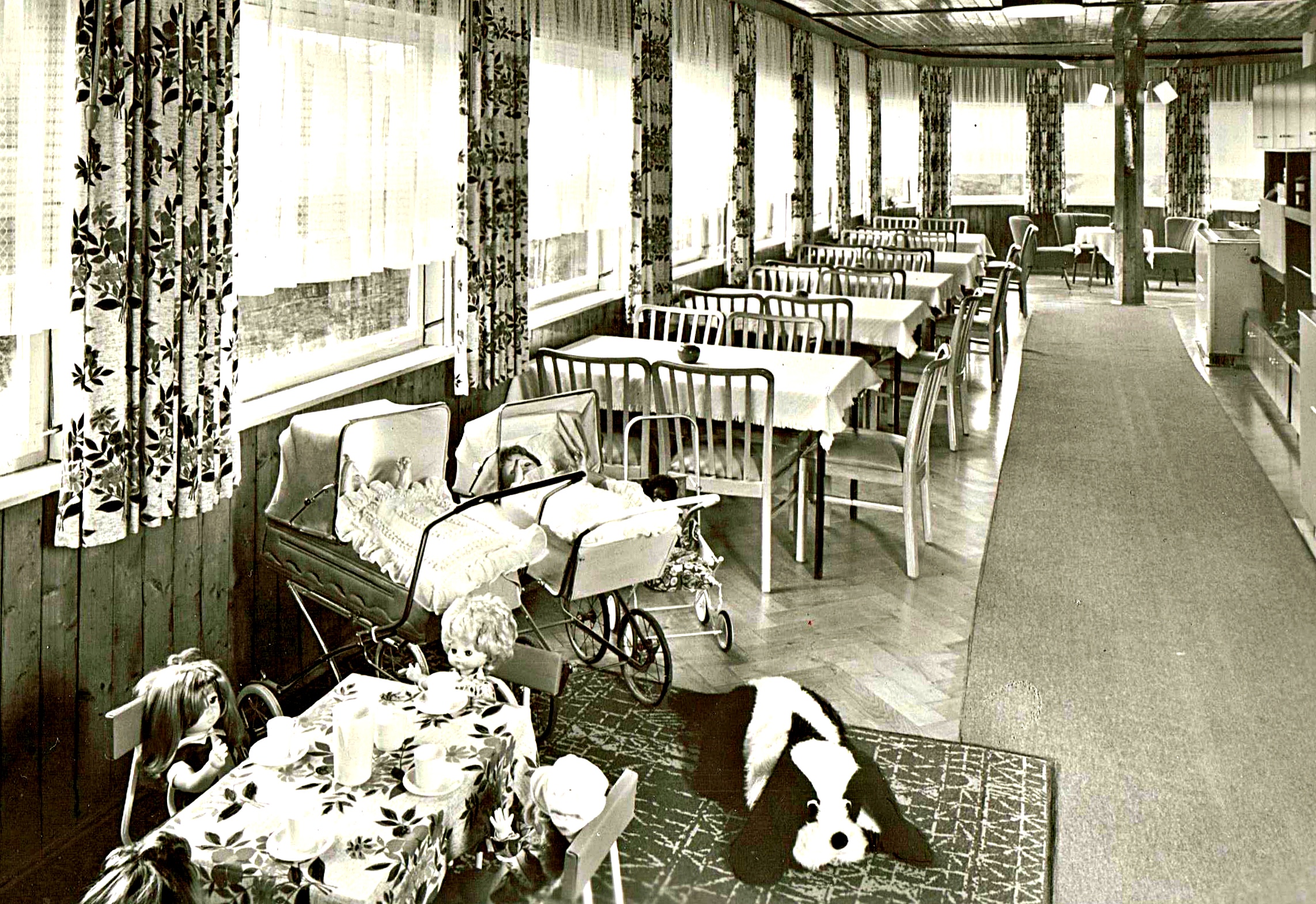 Hier sehen wir das gleiche Kinder-Kurheim-Restaurant im Jahre 1967. Inzwischen sind die blütenweißen Tischdecken längst mit Glasplatten belegt. Das ermöglicht eine leichte hygienische Reinigung, mindert den Aufwand und kein Kind braucht sich schämen, wenn mal etwas von der Speise verkleckert wurde – die Tischdecke bleibt sauber.