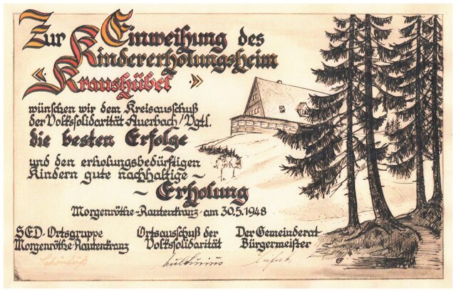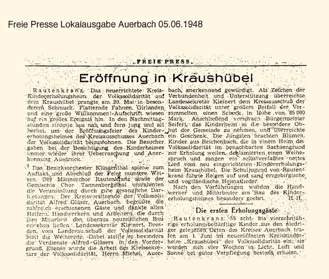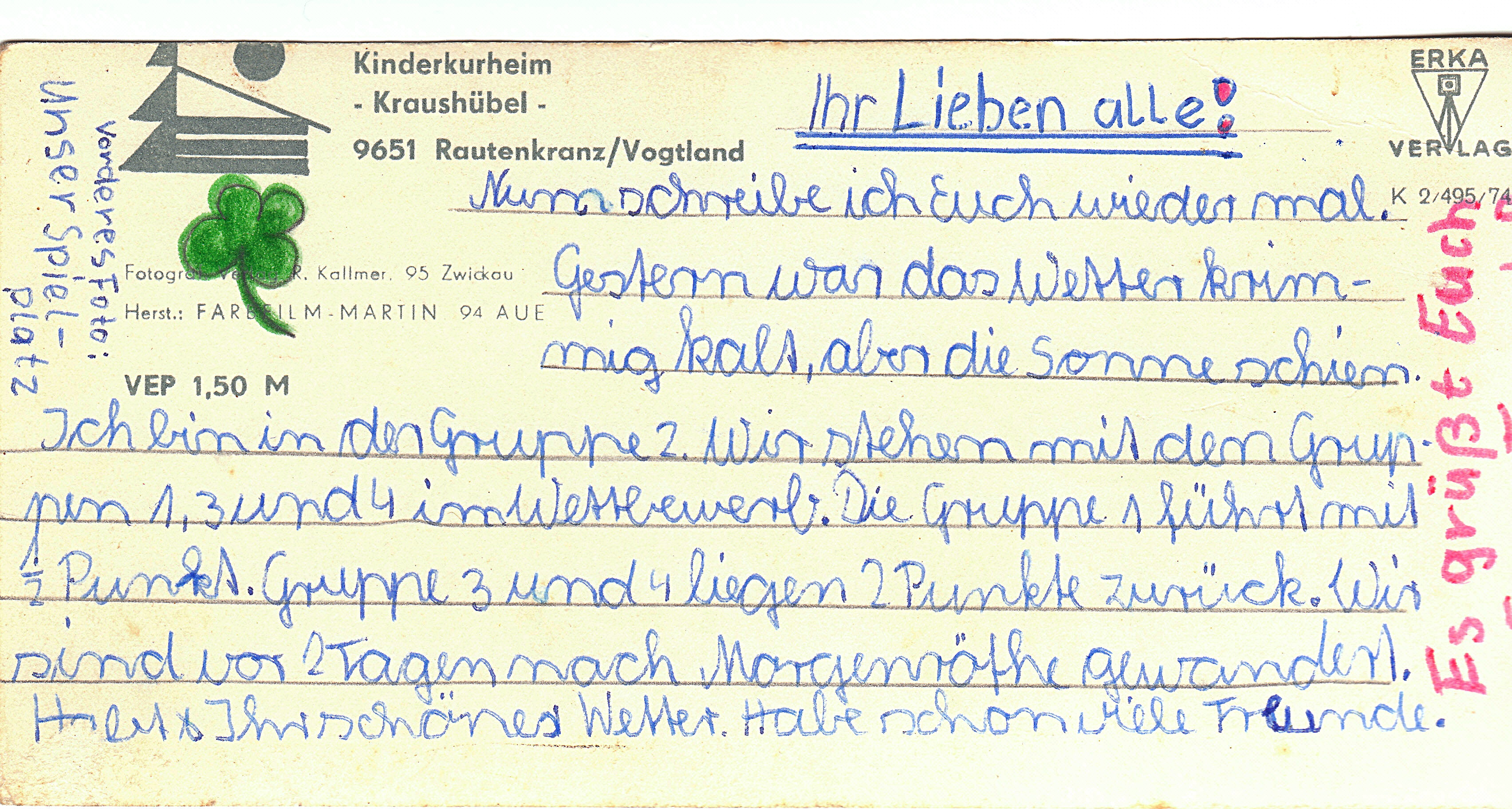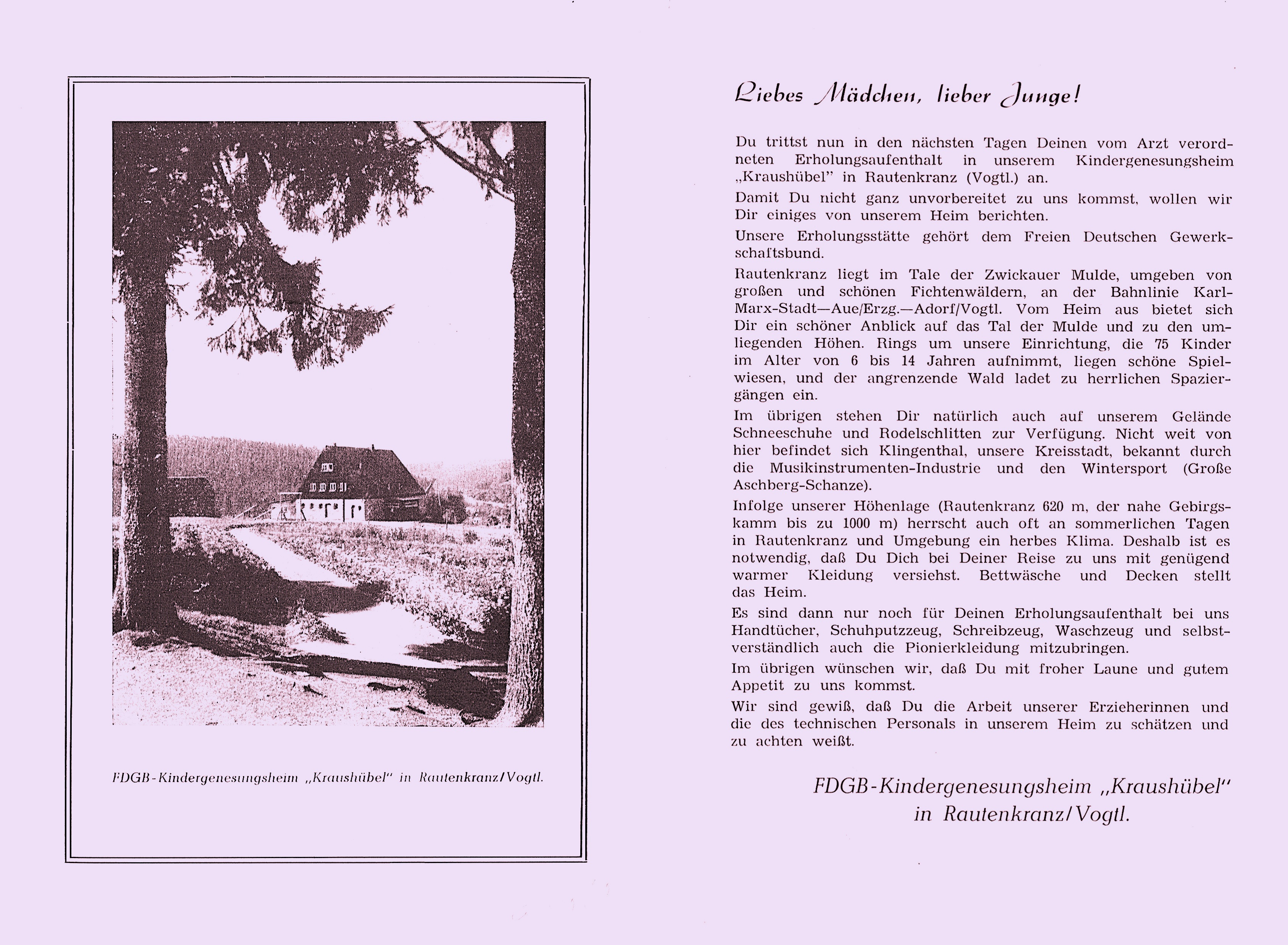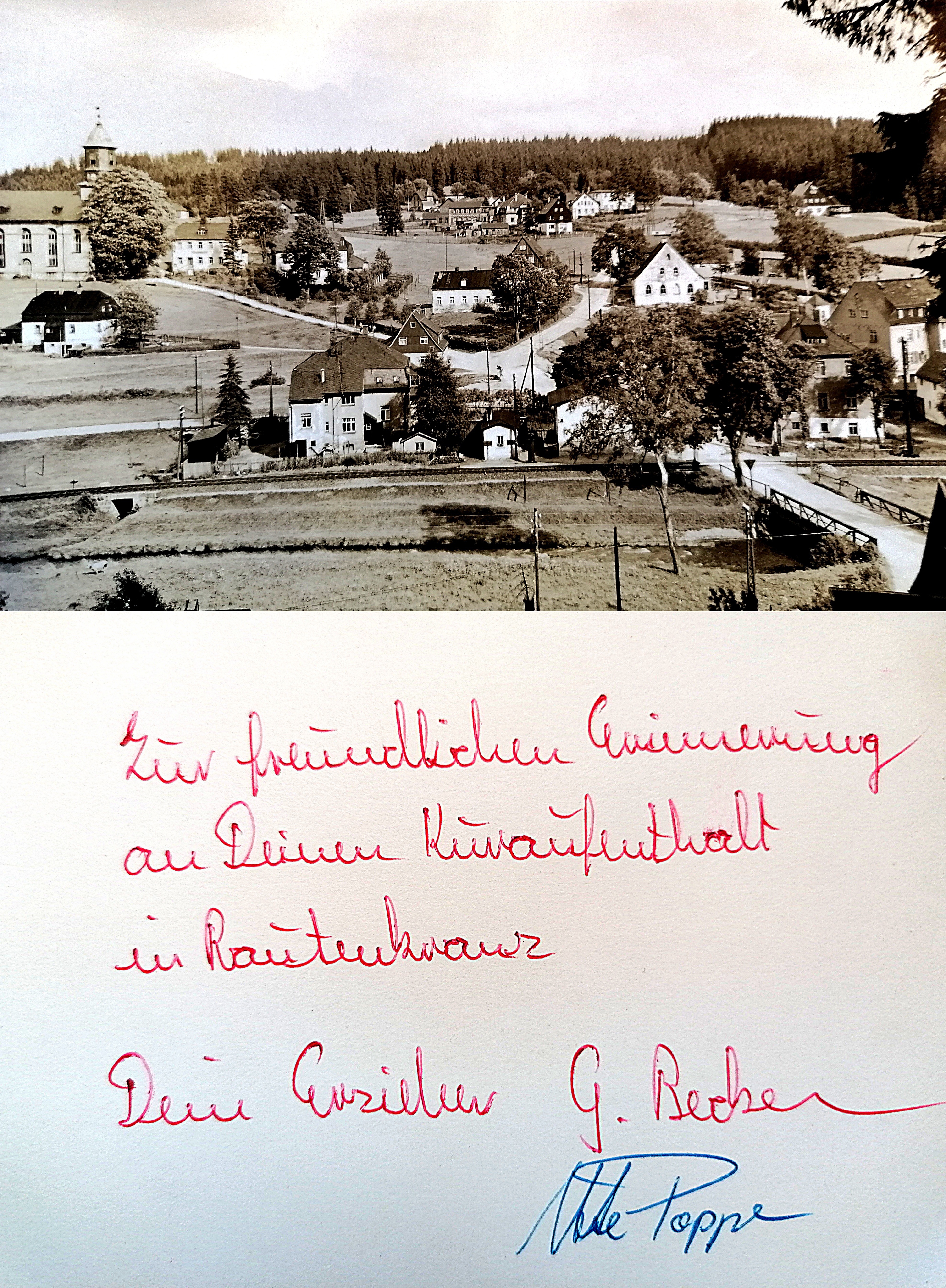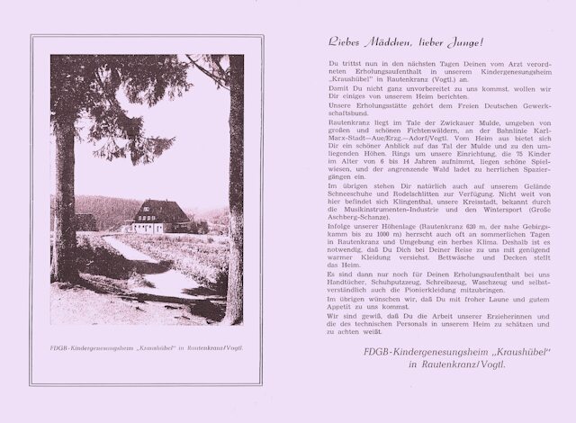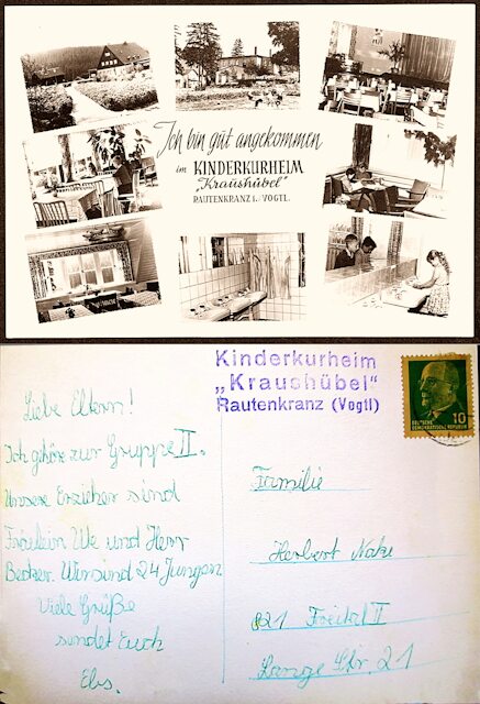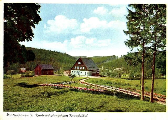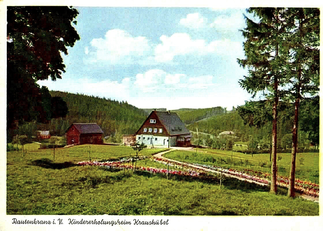 In Rautenkranz durften wir wunderschöne Erholungswochen genießen. Am 1. Juli 1958 begann hier unser Aufenthalt. Ich war in der Gruppe von Frau Haustein und Fräulein Hennersdorf. Danke! –