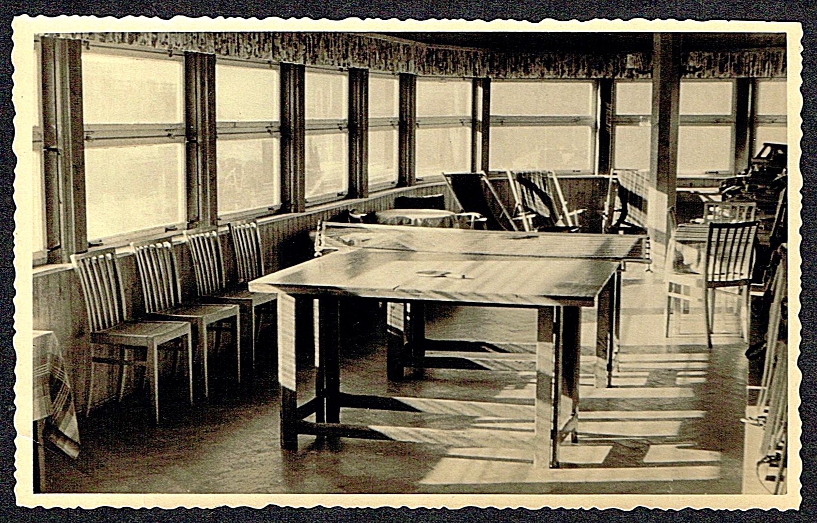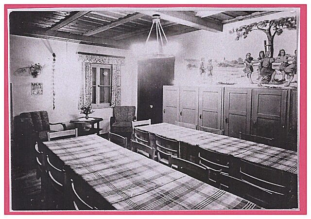 Der appetitlich wirkende Speisesaal in seiner Mobiliar-Erstausstattung (von 1948). Für die kleine nachmittägliche Milchkafé-Mahlzeit werden an den Sonntagen extra Festtagstischdecken aufgelegt, die jenen Tag auch optisch aus dem Erholungs-„Alltag“ hervorhoben. Die riesengroße Theater-Bühne dient Veranstaltungen vielfältiger Art. Hinter dieser Bühne besteht ein reicher Kostümfundus für das geschichten-gerechte Be- und Verkleiden der jungen Schauspieler.