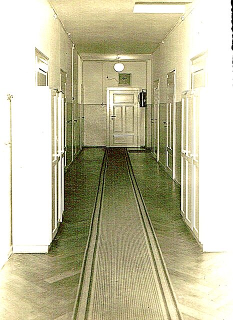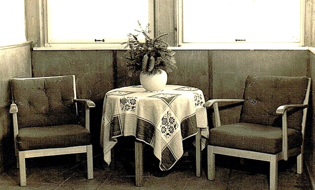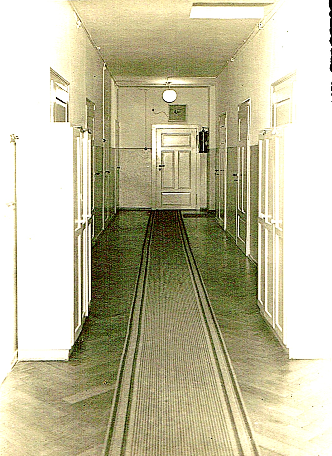 In diesem Raum durfte sich die jeweilige Nachtwächterin munter halten. Ein gutes Buch, ein würziger Tee ... sich zu vertiefen, war kaum möglich – bei hellhörendem Ohr, unterbrochen von Nachschaugängen, vielleicht zwischendurch eine oberflächliche Ruhe neben dem tickenden Wecker. – Sehr viel später, konnte die Heimleiterin endlich eine buchhalterisch tätige Kraft in ihr Kollektiv bekommen und so wurde dieser Raum dann für die Verwaltungskraft eingerichtet.