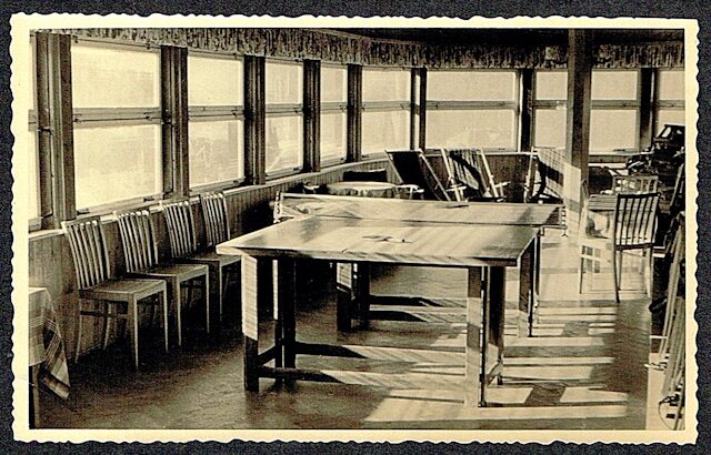 Die Sonnenveranda des Hauses bietet allen viel Platz, Luft und Licht. Sie lädt ein zum „schmökern“ in den Büchern und zu frohem Spiel, zum Gesichts-Sonnenbaden, selbst dann, wenn's draußen nicht sehr warm ist. In diesem besonderen Raum findet auch die gesonderte Morgengymnastik für Kinder mit Haltungsschäden statt, um die deformierte Wirbelsäule an ihre ursprüngliche Beweglichkeit zu erinnern und den Muskelaufbau zu unterstützen. Wichtig ist das Beibehalten der Übungen auch nach der Kur, im häuslichen Bereich!
