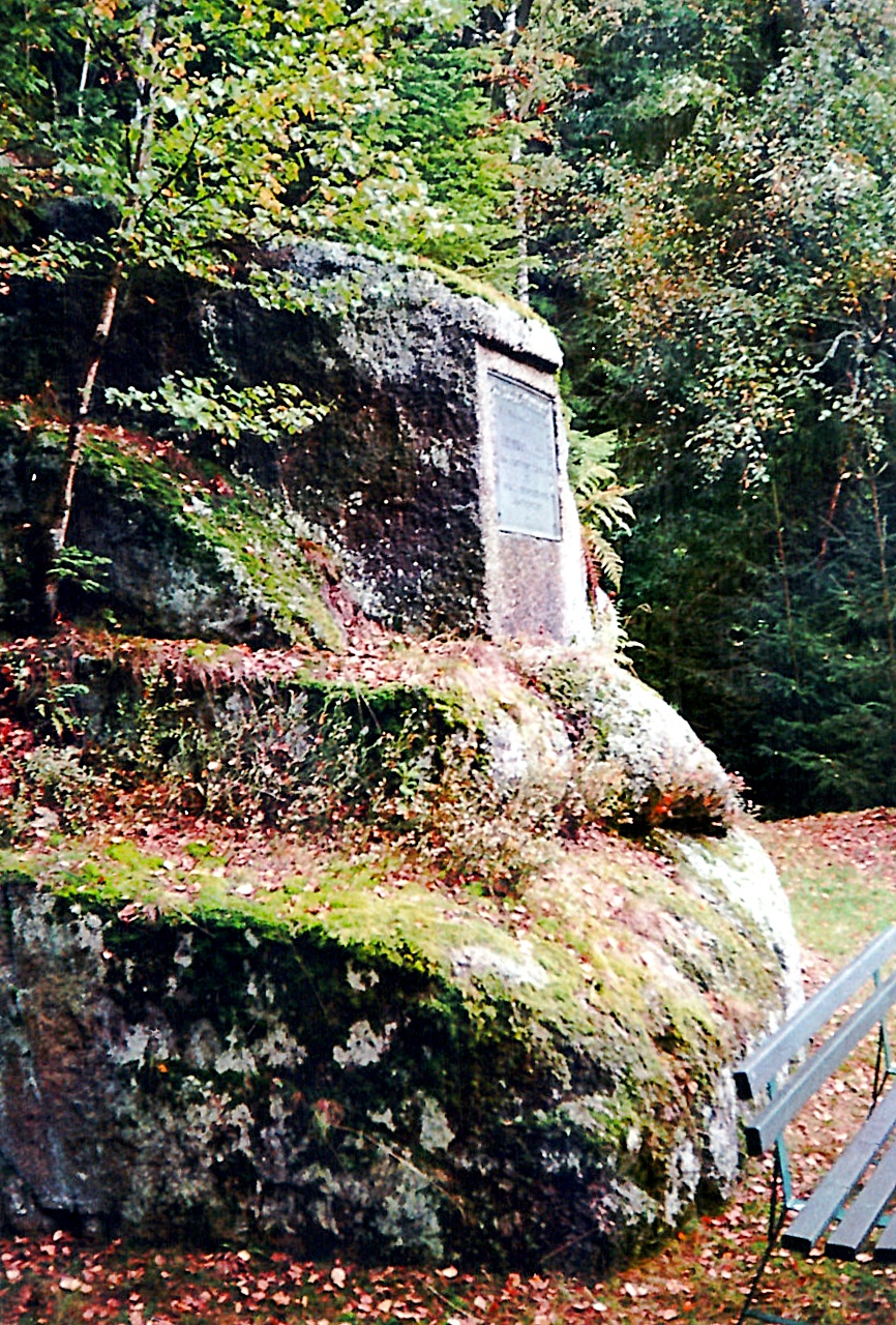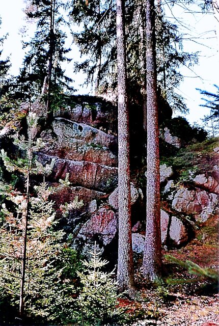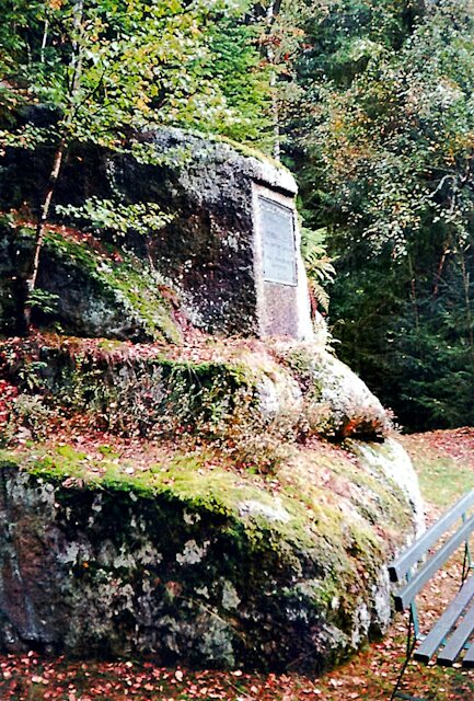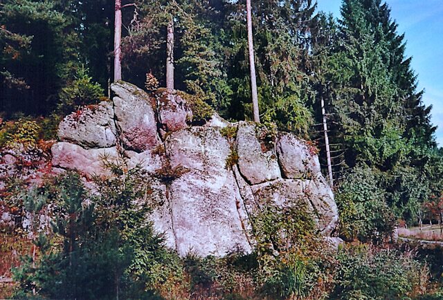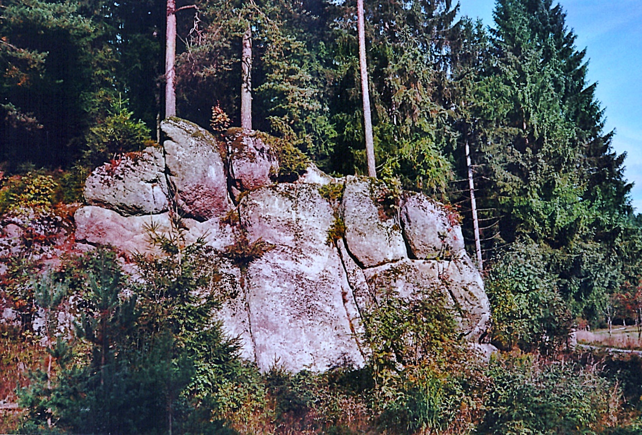 Das hohe Felsenmassiv mit einer Anmutung >so rot wie Blut< erinnert uns an den tragisch-tödlichen „Jungfernsprung“ im Dreißigjährigen Kriege, am Sandweg nahe dem Zinsbach vollzogen. Eine sehr traurige Begebenheit.