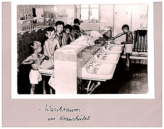 Dieser Schlafraum, im Parterre (Erdgeschoss) gelegen, gehört zu den Kindern der Gruppe II, den älteren Jungen. Den künstlerisch gemalten Wandschmuck, die Darstellungen mehrerer Burgen, das Dornröschen und vieles andere in weiteren Räumen des Hauses, gestaltete der Direktor des Museums Plauen, Herr Rudolf Donnerhack. Viele Jahre freuen sich die Kinder und das Personal an seiner gediegenen Arbeit. Danke! So soll es sein.