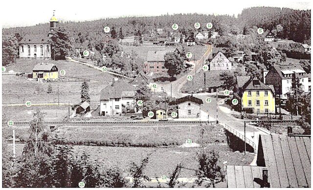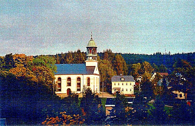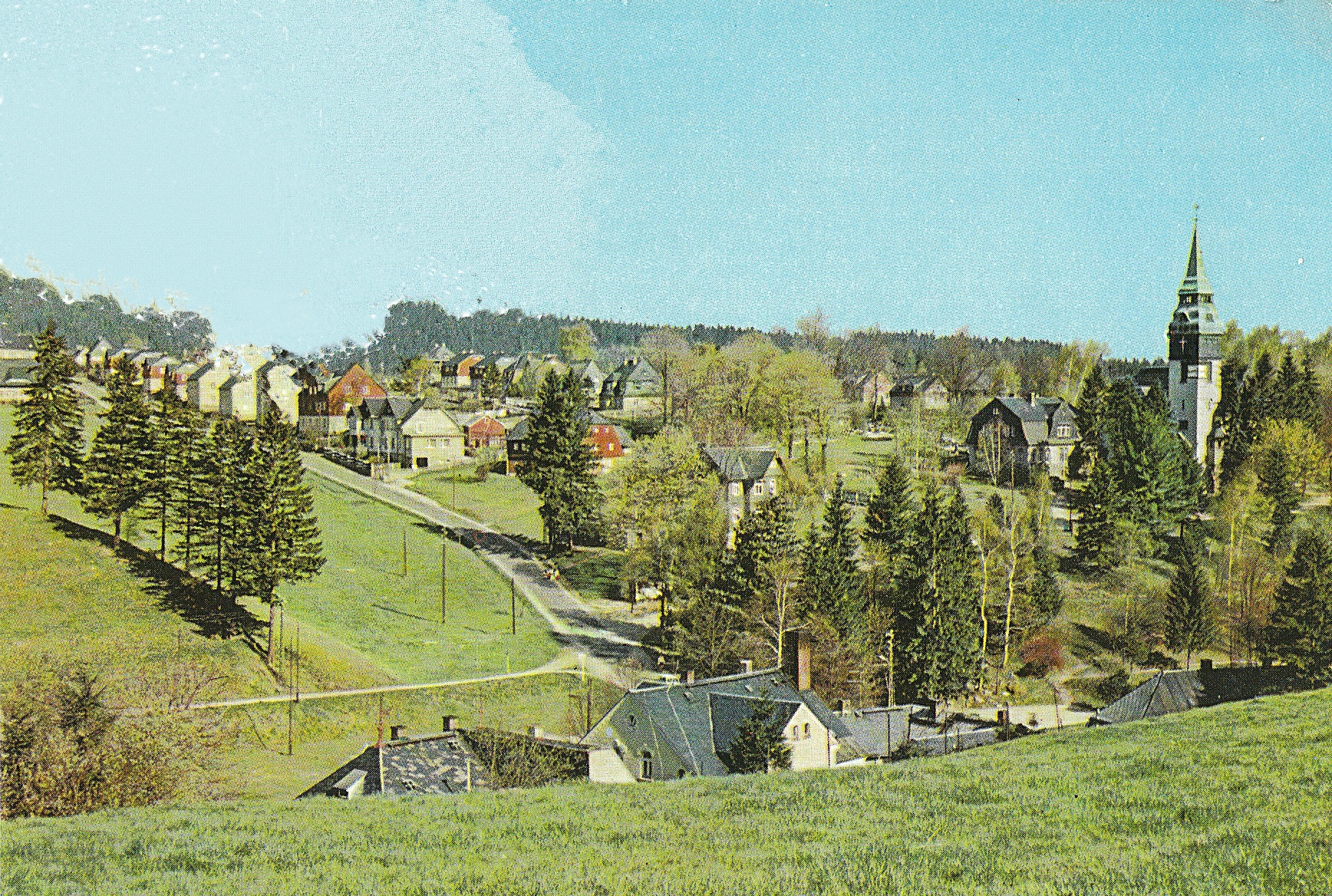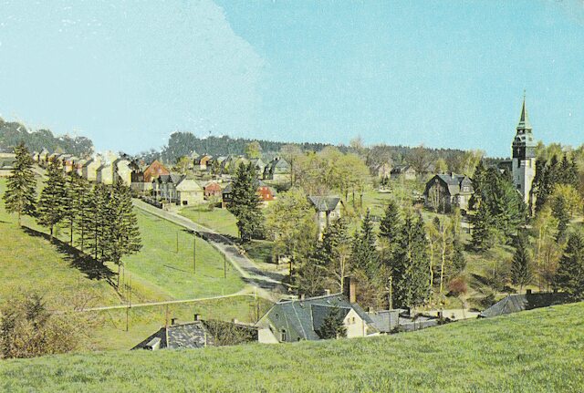 Blick vom Höhenweg auf die evangelische Kirche und den „Rat der Gemeinde“, die Kommunale Verwaltung des Ortes. Nicht sehr weit ist es von dort zum Geburtshaus und auch zum Haus der Jugendzeit des ersten Kosmonauten der DDR: Sigmund Jähn.