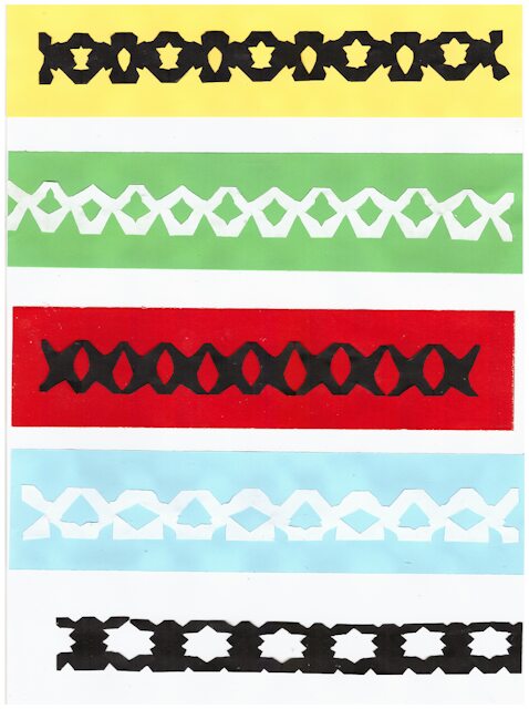 In den Zeiten der Beschäftigung basteln wir vielerlei Nützliches und Hübsches. Hier eine Scherenschnittarbeit, mit der wir zum Beispiel den Rand des Briefbogens für unsere Post an die Eltern zieren. Wir müssen dazu fleißig üben, aber Fräulein Hennersdorf, die uns viele Möglichkeiten zeigt, geht das recht flink von der Hand – sie bleibt in ständiger Übung.