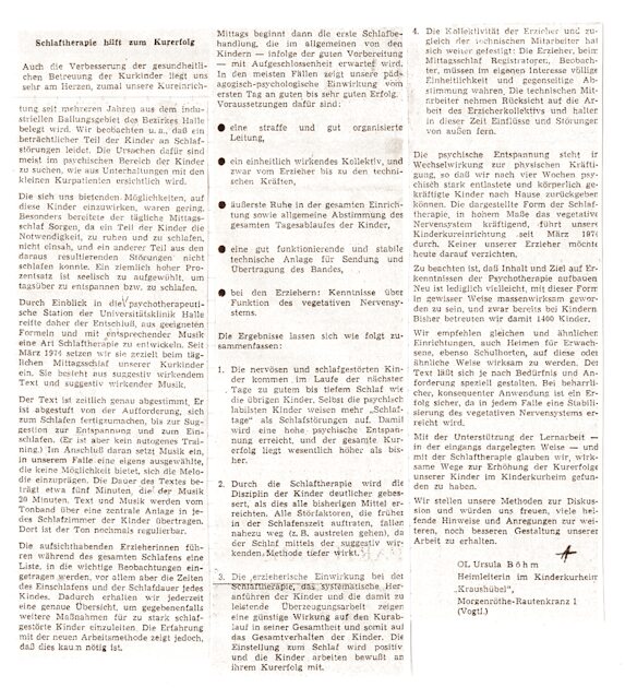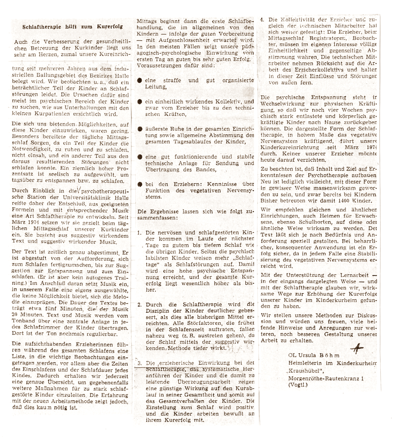 Hier geht es um die von der Heimleiterin Ursula Böhm und dem Ehemann und Lehrer Erhard Böhm erdachten und eingeführten Methode der tiefenentspannenden Einschlaf-Therapie. Diese trägt mit sorgsam gestalteten und einfühlsam gesprochenen Texten sowie geeigneter Musik zur weiteren Verbesserung des Kurerfolgs bei.