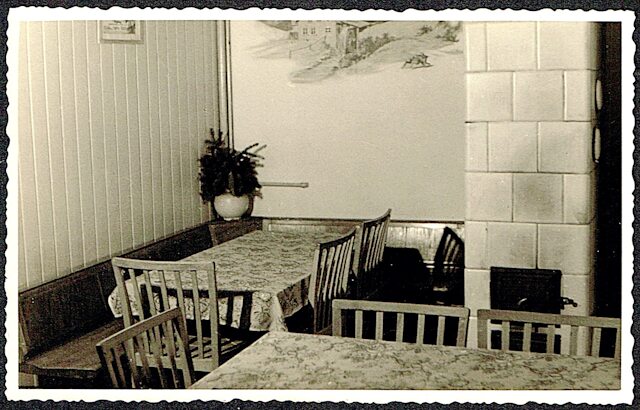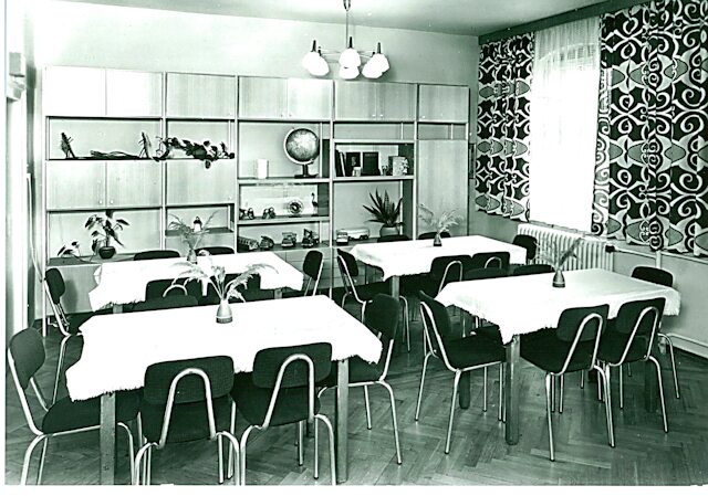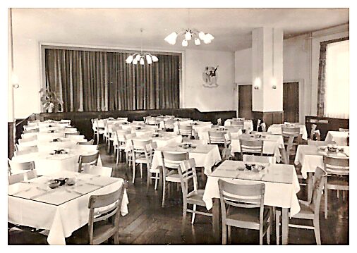 Dieser uns einladende Lieblingsgroßraum nach der farblichen Neugestaltung mit frischen Gardinen, hellem Theatervorhang und der dritten Generation von Stühlen auf dem nochmals verjüngten Parkett. Es gibt im Laufe der Zeiten immer wieder Modernisierungen und Verbesserungen im Kurheim.