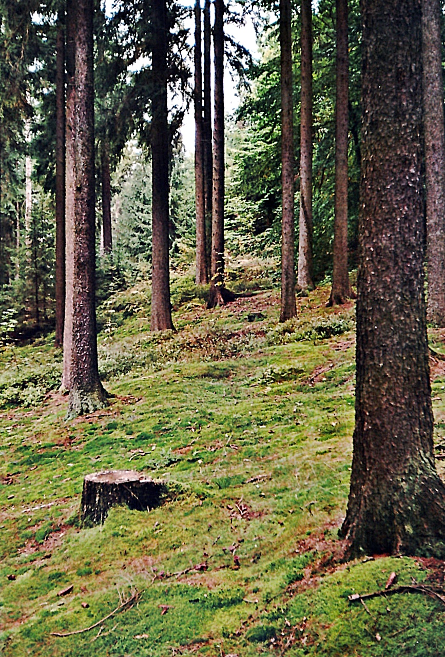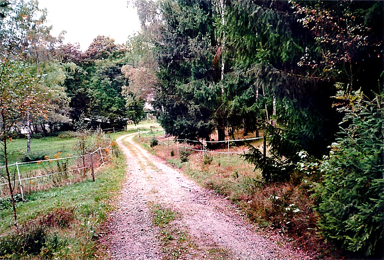 Die Bäume des Waldes im Hintergrund sehen etwa alle vier Wochen andere Kinder-Rücken. – Fräulein Poppe hat sich gerade fortbegeben. So ist das schöne Andenken leider nicht ganz vollständig.