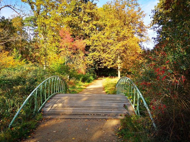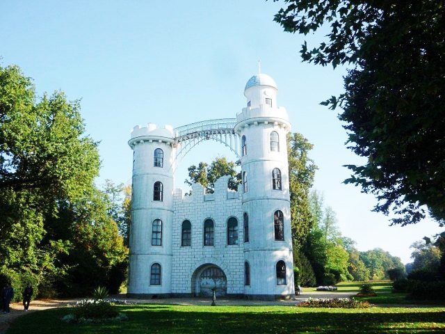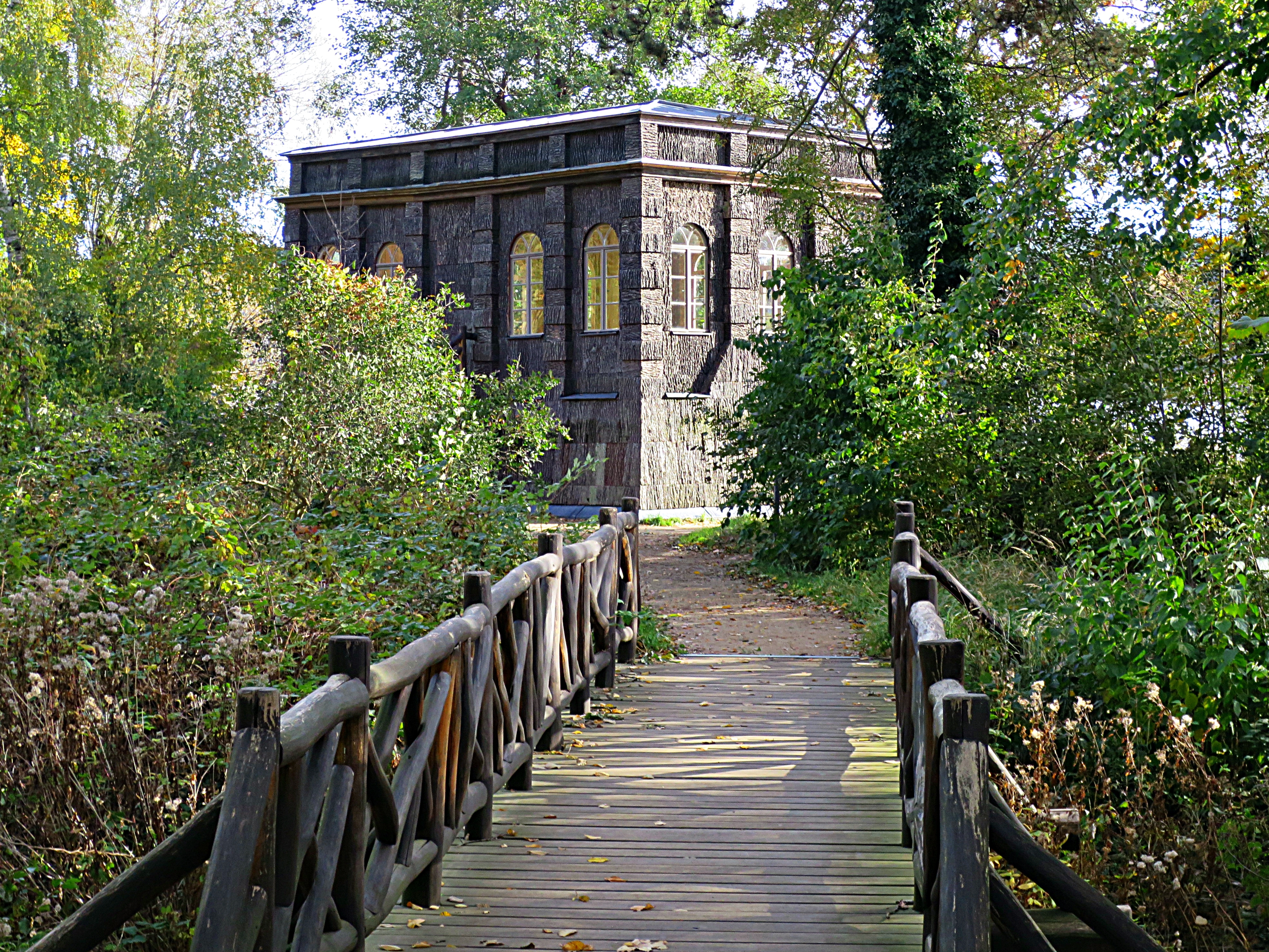 Wir verlassen diesen Ort, der die Garstlichkeit mit Gastlichkeit zu versöhnen sucht, über eine weitere, die grüne Gotische Brücke, denn die Jagdhütte ruht auf einem extra gestalteten und der Insel vorgeschobenem Inselchen.