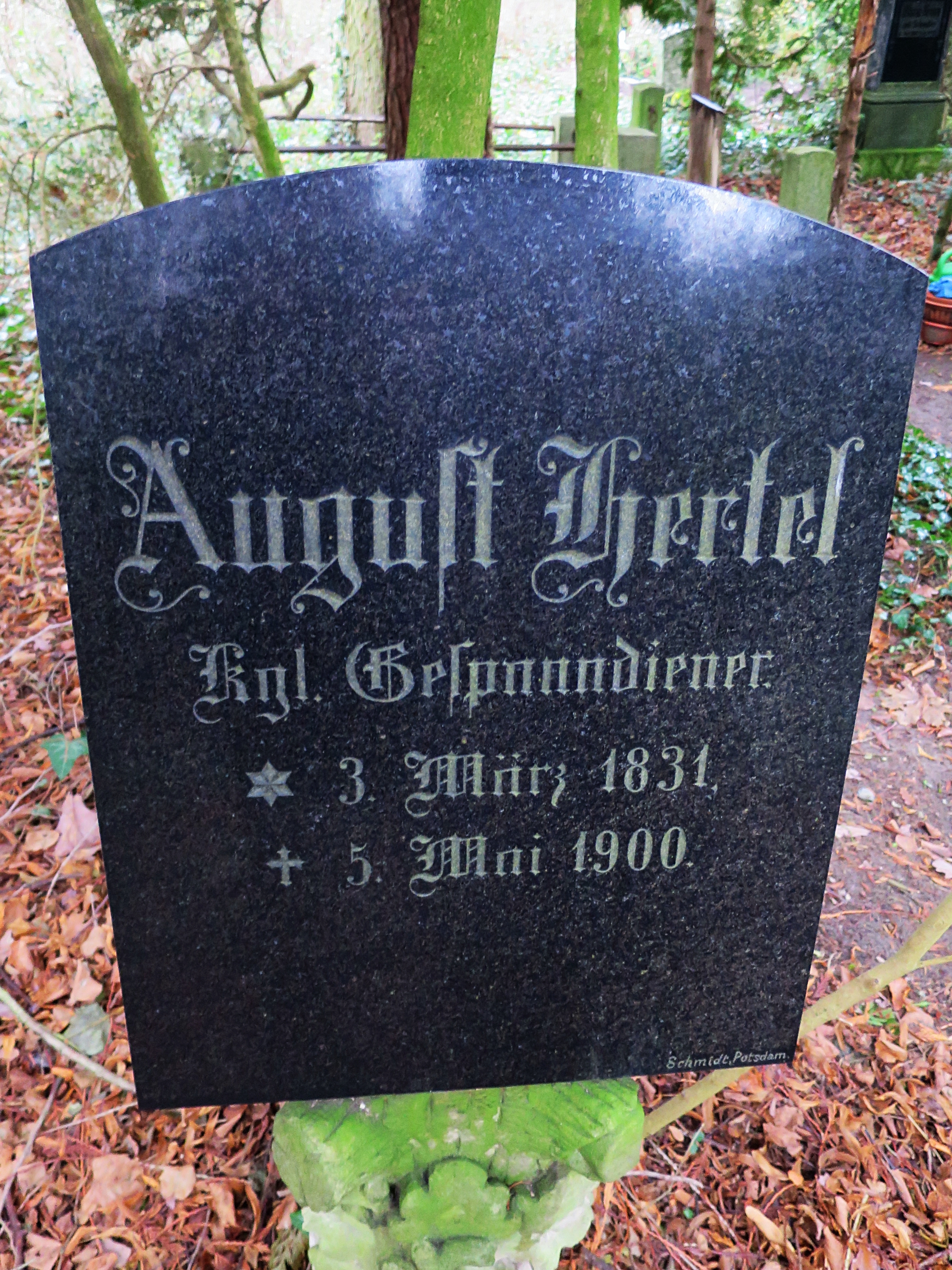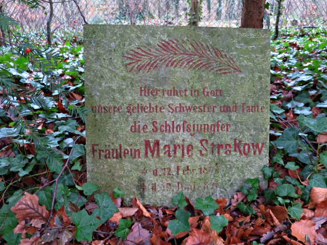 Das Grabdenkmal für das Schloßfräulein Maria Dorothea Strakonn / Strakon / Strakow, geboren in Rixdorf am 12. Februar 1805, gestorben auf der Pfaueninsel am 19. Juni 1878, letzte Ruhe im Friedgarten auf Nikolskoe. Eine Anzahl von Grabsteinen wurden wohl bei den Kampfhandlungen des Krieges im April 1945 zerstört aber einige in späteren Jahren ersetzt. Vom großen Schlossbediensteten Licht finden wir hier leider keine oberirdisch sichtbare Spur mehr.