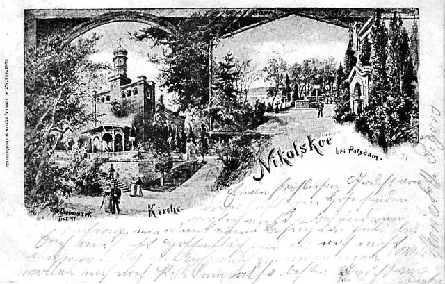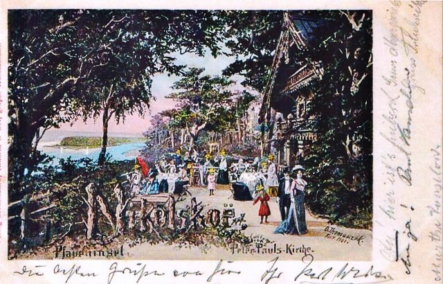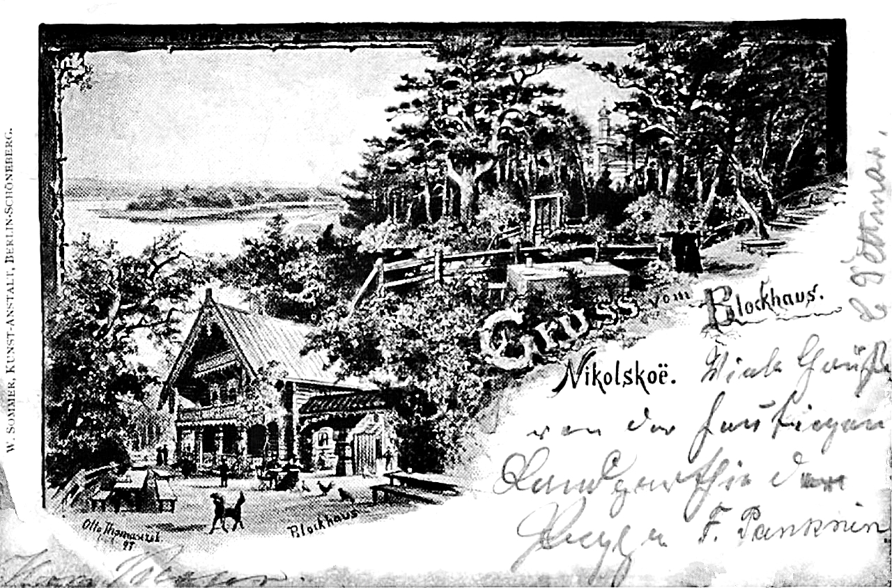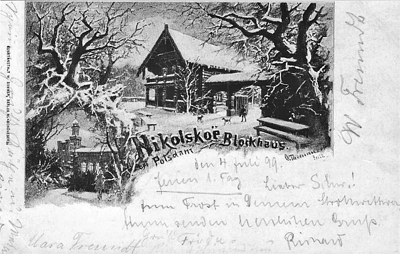 Der Blockhäuser-Komplex Nikolskoe wurde ganz in der Nähe auf dem Festland im Düppeler Wald errichtet. Der lichte Waldessaum ermöglicht den Blick auf die Insel. Die neuen Blockhäuser 1819 dem russischen Zaren und seiner Frau zugeeignet, von der Königlichen Familie und ihren Gästen genutzt, werden später für das Volk freigegeben, darinnen ein Wirtshaus eingerichtet. Deshalb durfte man dem vollbärtigen Verwalter und Gastwirt Iwan Bockow (1777–1856), vormals Leib-Kutscher des Zaren Alexander I. und dann des Königs Friedrich Wilhelm III.) seine Wünsche antragen. Im russischen Originalton sprechen wir das Anwesen richtig als „Nikolskoje“ aus. Wer oder was aber ist Nikolskoe? Das wird in des Berichtes Vorwort auf Seite 1 beantwortet. Bildnachweis: Ansichtskarte mit Zeichnung / Gemälde von Otto Thomaszcek, um 1897.