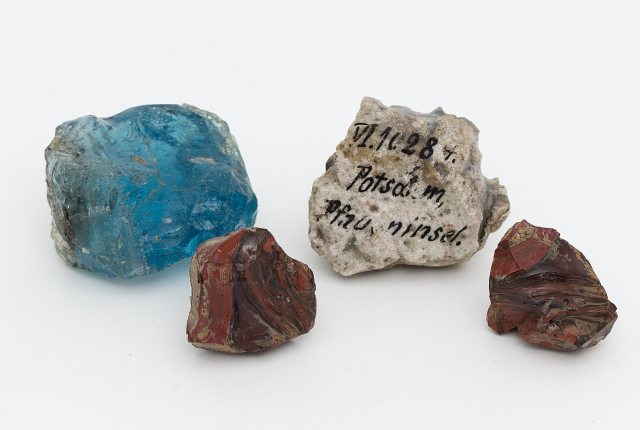Was blieb? Hier Glas-Geschmelz-Beispiele, gefunden auf der Pfaueninsel an der Stelle, an der das Laboratorium von Johannes Kunckel bis zum Brand gestanden hatte. Abfallschenkung des Königlichen Oberhofgärtners Reuter (der Mann, der nach dem jüngeren Fintelmann kam) an das Märkische Museum in Berlin, Am Köllnischen Park 5. Bildnachweis: Glas-Schlackesteine von Kunckels Laboraturium auf der Pfaueninsel, Berlin, 1679-1693 3,50 cm x 5,00 cm x 4,50 cm, Inv.-Nr.: VI 10284 a-d, © Stiftung Stadtmuseum Berlin. Reproduktion: Michael Setzpfandt.