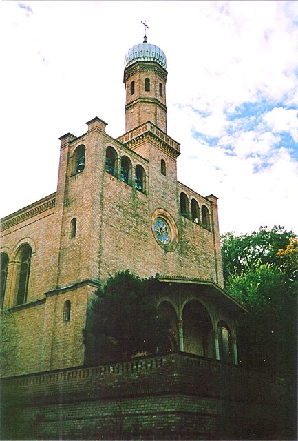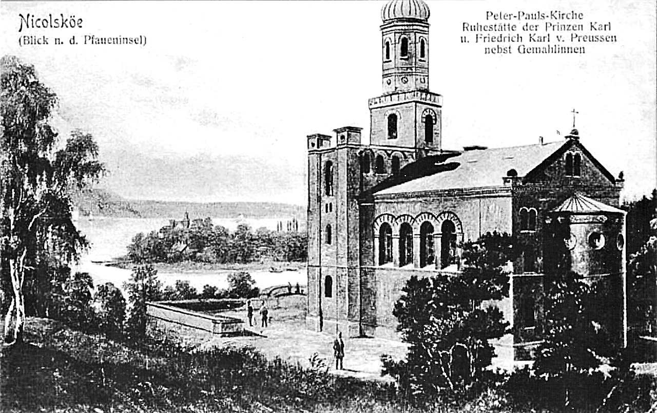 Die „Russische Kirche“, die im Aussehen wenig orthodoxes bietet, wurde dem Gedenken an die Apostel Petrus und Paulus gewidmet. Bauzeit 1834 bis 1837. Der hohe Aufwand des Kirchenbaus war für die Zaren-Besuche und die eher geringe Anzahl von Gläubigen der Pfaueninsel und derer des Dorfes Klein Glienicke gedacht. Bildnachweis: Ansichtskarte ohne Urheber-Nennung. Vermutlich der Ausschnitt aus einer Arbeit unseres Otto Thomasczek, bereits vor 1900, gemeinfrei.