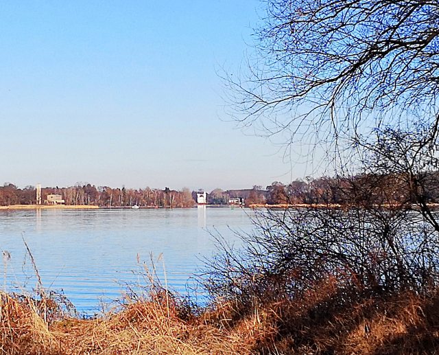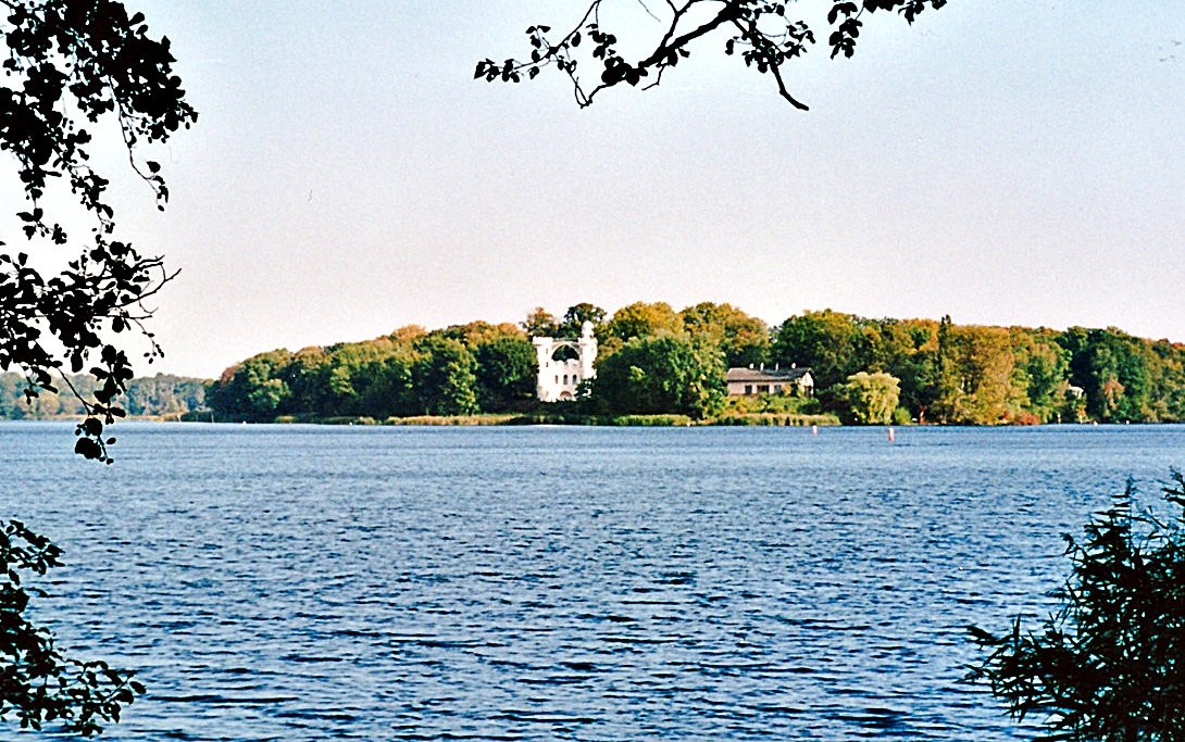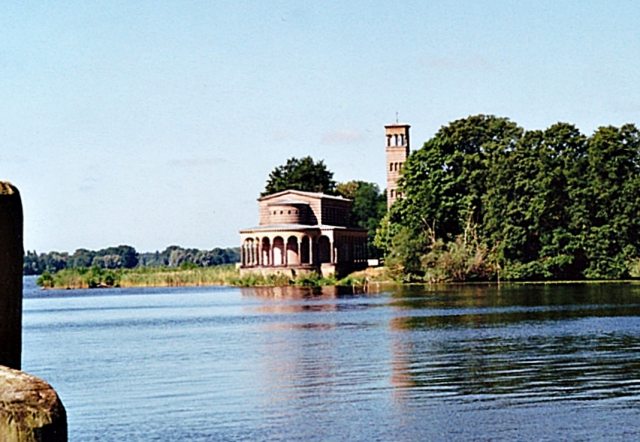 Für diesen Blick müssen wir allerdings ein Stück in Richtung Potsdam (fast bis Moorlake) gehen, um die Heilandskirche sehen zu können, die wie ein Schiff am Havelgestade liegt, nahe dem Dörfchen Sacrow. Die Inselbewohner zur Zeit der preußischen Könige hatten diesen Anblick anfangs nicht, denn die Kirche, mit italienischer Prägung, wurde nach Königlichen Vorstellungen erst vom Hofbaumeister Ludwig Persius entworfen, dann gebaut und 1844 fertiggestellt. – In den Jahren zwischen 1961 und November 1989 war dann der Besuch dieses Gotteshauses verboten und verhindert. Lebensgefahr als Strafe bei Nichtbeachtung. Auf Befehl von nicht ganz so weit oben. Aber nach jener Zeitepisode war schon bald wieder manches gut!