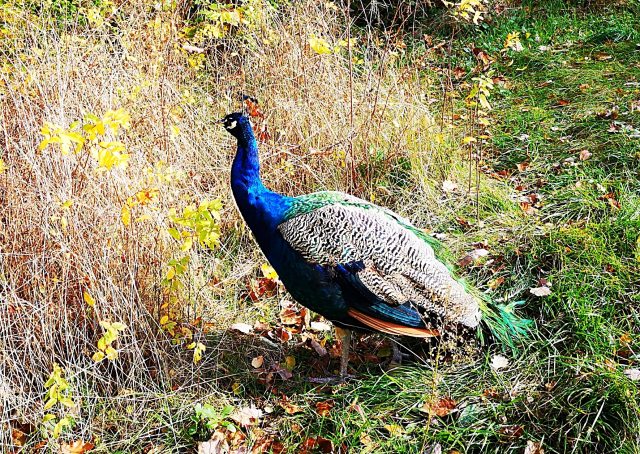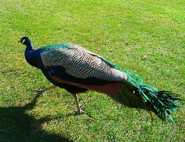 ... aber hier schon wieder ein freier Insel-Pfau. Im 21. Jahrhundert werden es etwa 30 Pfauen sein, die hier ihr Wesen treiben und – wenn man zur rechten Zeit am rechten Ort weilt – ihr Federkleid auch einmal „zum Rad“ auffächern.