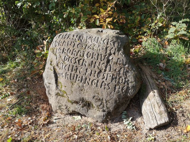 Der Kunckelfels - im Übersichtsplan Nr. 23. Er markiert den früheren kurzzeitigen Standort (1685–1689) von des Apothekers, Alchemisten und Glasmeisters Johann(es) Kunckel (etwa 1630–1702) abgebrannter Glasschmelzhütte, der Alchemie-Küche nebst einer schlichten Wohnunterkunft. In diesem Stein ist die Inschrift graviert: „Johann Kunckel erbaute 1685 sein Laboratorium auf dieser Insel. Er stellte Phosphor- und Rubinglas her“... – und noch viel mehr, darf ich ergänzen.