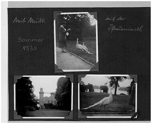 Wir sind auf dieser Insel weder die einzigen noch die ersten Gäste. Auch Margarethe Sommer war schon im Sommer 1930 hier. Hinweis auch an diese Mutti: Bitte das Mästen der wilden Haustiere unterlassen! Sie ernähren sich hinreichend mit artgerecht-bekömmlicher Atzung. Diese Pfauen zeigten sich auch schon bei damaliger Farbsicht unbunt-hell. Es sind keine Albinos, aber im Vergleich mit Uhus sind es Vögel der Weißheit.