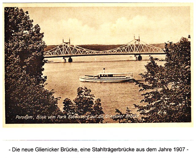 Andere Leute bevorzugen einen Spaziergang über die zweifarbig-grüne Glienicker Brücke. Diese wurde im Jahre 1907 erstmals montiert, nach den schweren Kriegsschäden erneuert. In jenen Jahren, als Deutschland von einer Grenze gespalten war, hatte die Potsdamer Hälfte schwer an dem Namen „Brücke der Einheit“ zu tragen. Links liegt Potsdam, rechts befindet sich Berlin. Der Uferweg auf der Berliner Seite, links hinter der Brücke, führt direkt zur Pfauen-Insel. Die nicht Wasserscheuen unter uns, wählen für die kurze Wasserwanderreise auch gern ein Schiff. Dieses hier – ist auf dem Heimweg nach Potsdam. Bildnachweis: Eine historische Ansichtskarte, gemeinfrei