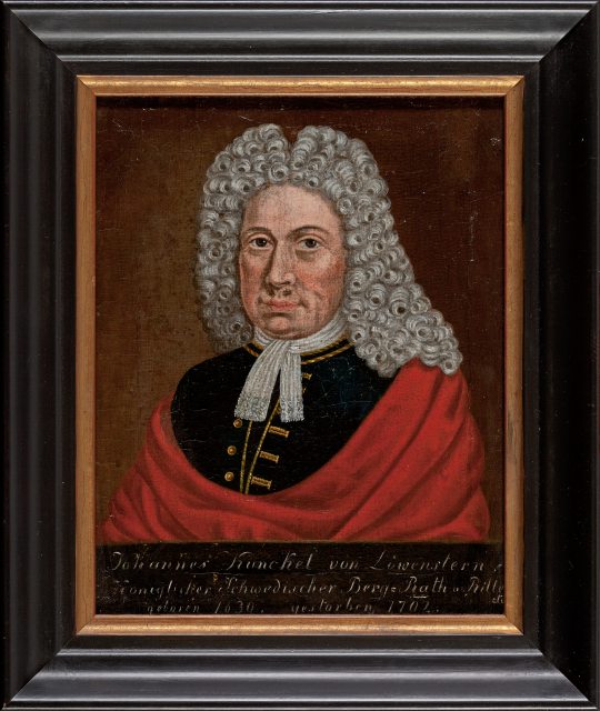 Sinnspruch: „Wissenschaft, Erfahrenheit und Verstand von allen Sachen, wollen diesen wehrten Mann nunmehr unvergleichlich machen und die Wahrheit, die das Ziel wonach seine Augen funkeln, krönt mit hohen Adel schon dessen Namen Johann Kunkel“. Bildnachweis: Ein heute unbekannter Künstler schuf dieses Werk. Bildnis Johannes Kunckel, um 1690, Öl auf Leinwand, Gemäldemaß: 22,00 x 17,50 cm, Inv.Nr.: VII 59/135 x, © Stiftung Stadtmuseum Berlin, Reproduktion: Michael Setzpfandt, Berlin.