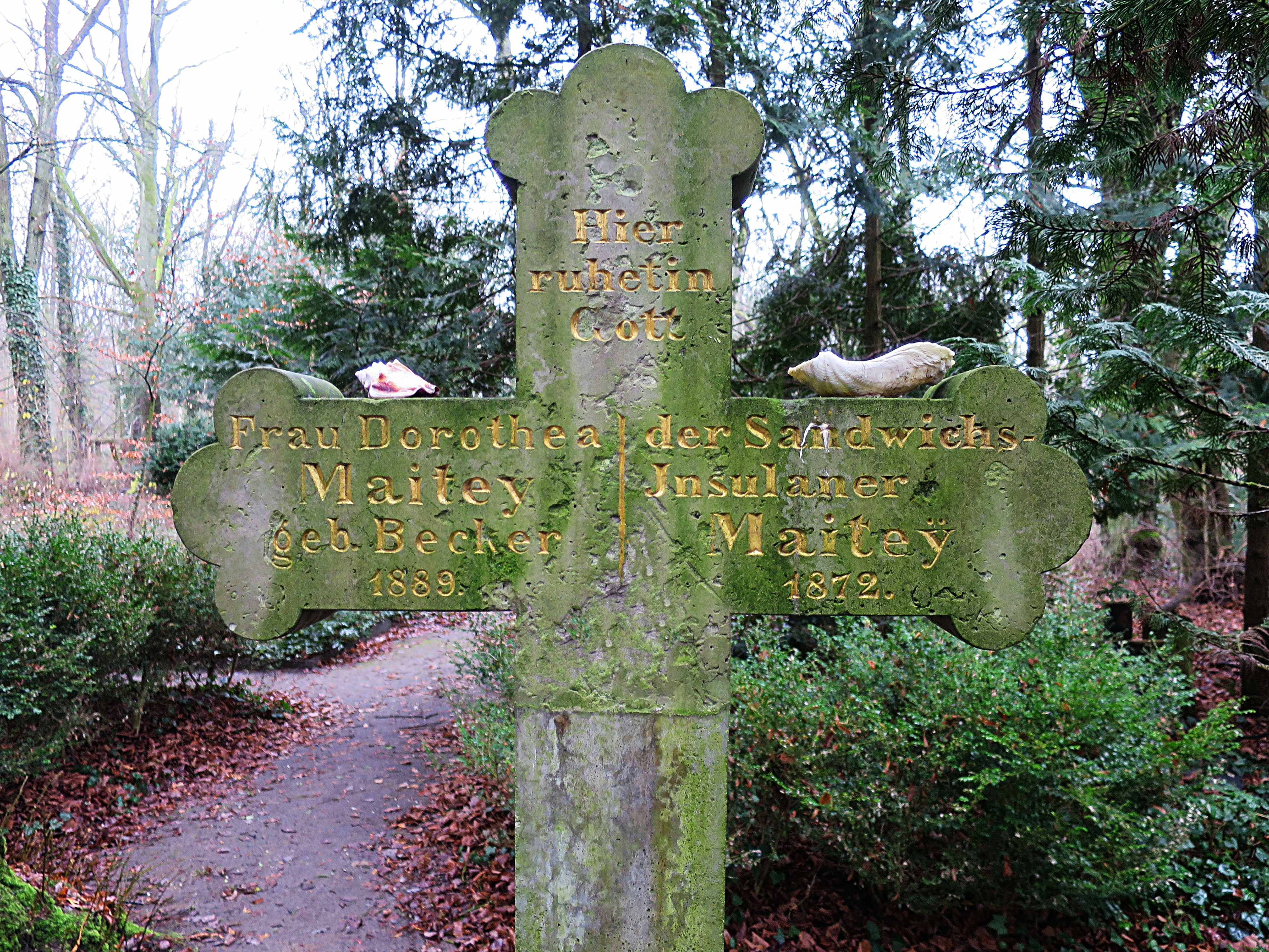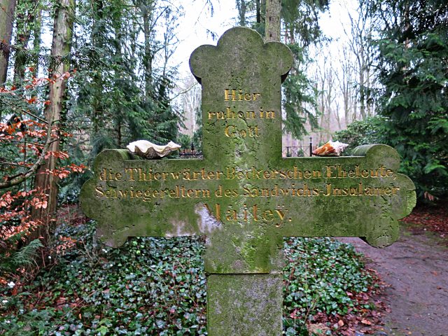 Das gleiche Denkmal von der anderen Seite ist der Erinnerung an Dorothea Becker, Tochter des Tierwärter-Paares und ihrem Ehemann Heinrich Wilhelm Maitey gewidmet. Geboren worden war er auf Hawaii am 23. April 1807, auf der Pfauen-Insel und in Klein Glienicke hatte er gearbeitet und gewohnt. Sein Lebenslauf hatte sich in Klein Glienicke am 26. Februar 1872 geschlossen und seine letzte Ruhe fand er auf Nikolskoe.