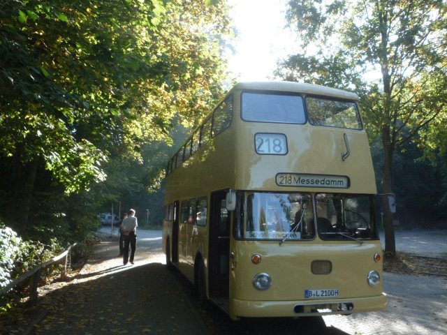 Eine der bequemen Fahrmöglichkeiten zur Insel – mit dem modernen Bus der Linie 218 ab Bahnhof Wannsee bis zur Endhaltestelle Pfauen-Insel. „Er“ kennt diesen Weg hinreichend gut, denn seit 1955 rollt er auf dieser Strecke.