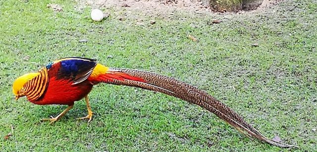 Die Ausstattung mit Fasanen erhielt die Insel aus der Fasanenzucht in der Parkanlage „Neuer Garten“ in der nahe gelegenen Residenz Potsdam. Dort also ein Käfig-Goldfasan ...
