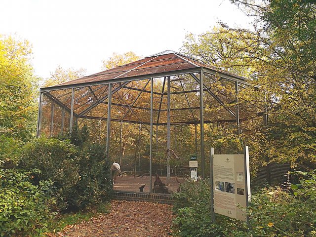 Die kleine Voliere in der Nähe des massiven Winterquartiers bietet den noch unerfahrenen jungen Pfauen einen sicheren Hort vor hungrigen Füchsen und anderem interessierten Raubzeug - im Übersichtsplan Punkt 26 -.