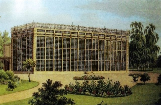 So gestaltete der geniale Baumeister Karl Friedrich Schinkel den Palmenpalast – in einer Formgebung, die den Auffassungen seiner Zeit weit voraus eilte. Errichtet 1828–1831 - im Übersichtsplan Punkt 09 -. Wegen des enormen Höhenwuchses der großen Fächerpalme erhielt das Gebäude an zentraler Stelle des geplant durchbrochenen Daches vorerst einen Glasquader aufgesetzt. Später wurde jener mit einem gläsernen Zwiebelturm erhöht und als auch dieser der Zentralpalme nicht reichte, der Fußboden unter ihr ausgeschachtet, sie tiefer gesetzt. Aus ungeklärter Ursache, wie offiziös nur leise verlautbarte, brannte das Gebäude im Frühling des Jahre 1880 ab und wurde nicht erneuert. Hohe Kosten und mangelndes Interesse standen einem Wiederaufbau entgegen. Bildnachweis: Vasenbild, optisch entzerrt, Pfaueninsel (isle of peacocks) near Berlin. The Palmenhaus (house of palmtrees). Painting from a vase, detail. Datum 1836. Own scan from: Berlin durch die Blume oder Kraut und Rüben. Gartenkunst in Berlin-Brandenburg , catalogue for an exhibition. Nicolai Berlin 1985. ISBN 3-87584-147-6. Urheber: Anonym. Genehmigung zur (Weiternutzung dieser Datei) PD-old, gemeinfrei.