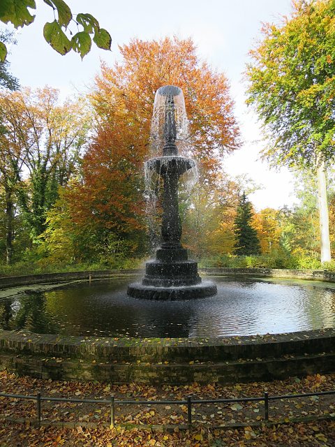 Die Fontäne auf dem höchsten Punkt der Insel wird seit 1822 durch eine Dampfmaschinen-Pumpe mit Havelwasser versorgt (heute aber elektromotorisch) - im Übersichtsplan Punkt 28 -. Diese Fontäne wird in älteren Literaturwerken öfter als Candelaber oder als Wasserkunst ausgewiesen. Sie ist es ja auch. Vom gefüllten Becken fließt das lebensspendende Nass in natürlichem Gefälle in den südwestlichen Inselbereich, wo es der Pflanzenversorgung dient. Selbst ein kleiner „Gebirgsbach“ wird von dem Wasser gespeist.