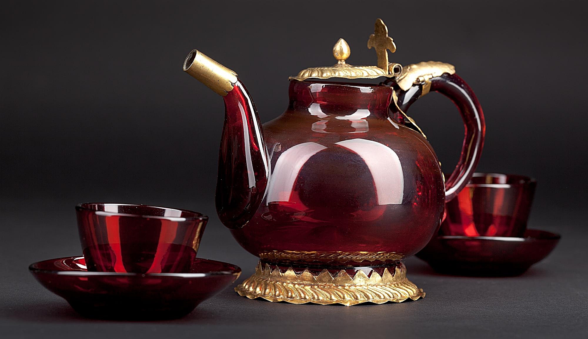 Kaninchenwerder: kostbare Kanne + Köppchen – kleine Kostproben Kunckels köstlicher Klarglas-Kunst. („Köppchen“ ist eine Tasse ohne Henkel, ein Becher, vom lat. Cuppa, vergleiche: niederländisch Kopje. engl. cup of tea, deutsch seltener: Tassenkopf + Untertasse). Bildnachweis: Johannes Kunckel, Teekanne aus Goldrubinglas und 2 Koppchen, hergestellt in der Residenz Potsdam, 1679-1693, Goldrubinglas mit vergoldeter Silbermontierung; H: 12,00 cm, B: 17,30 cm, Inv.Nr.: II 62/518 A; II 62/528 c, d, A, © Stiftung Stadtmuseum Berlin, Reproduktion: Michael Setzpfandt, Berlin