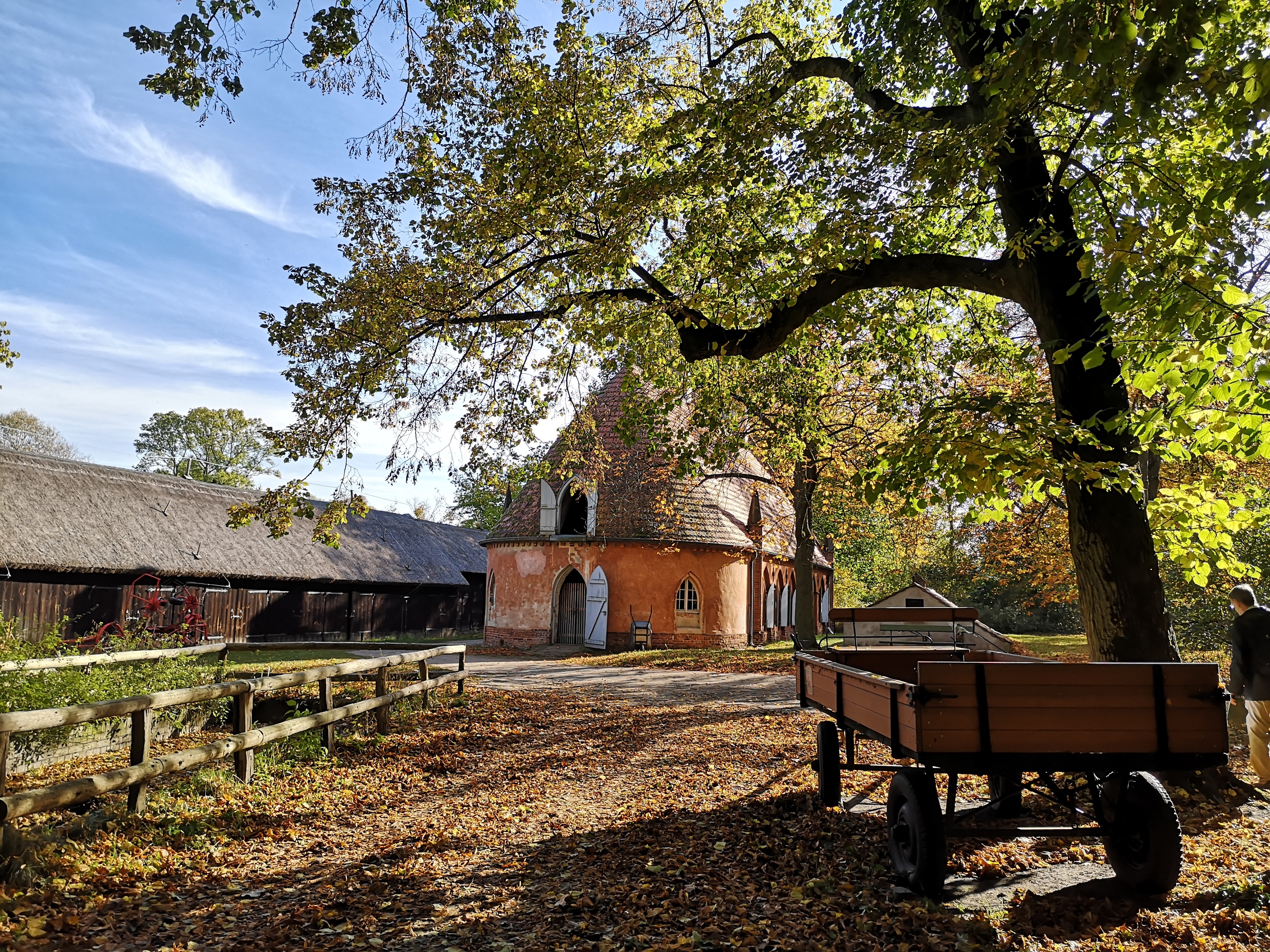 Zum Gehöft zählen wir auch die Ställe, Scheune und Remise mit Platz zum Aufbewahren mancherlei Dinge einer bäuerlichen Wirtschaft. Die ersten Pfauen kamen bereits 1795 auf die Insel – vom nahe gelegenen landwirtschaftlichen Gut Sacrow, also vom gegenüber liegenden Ufer der Havel. Sie hatten eine nur kurze Überseereise.