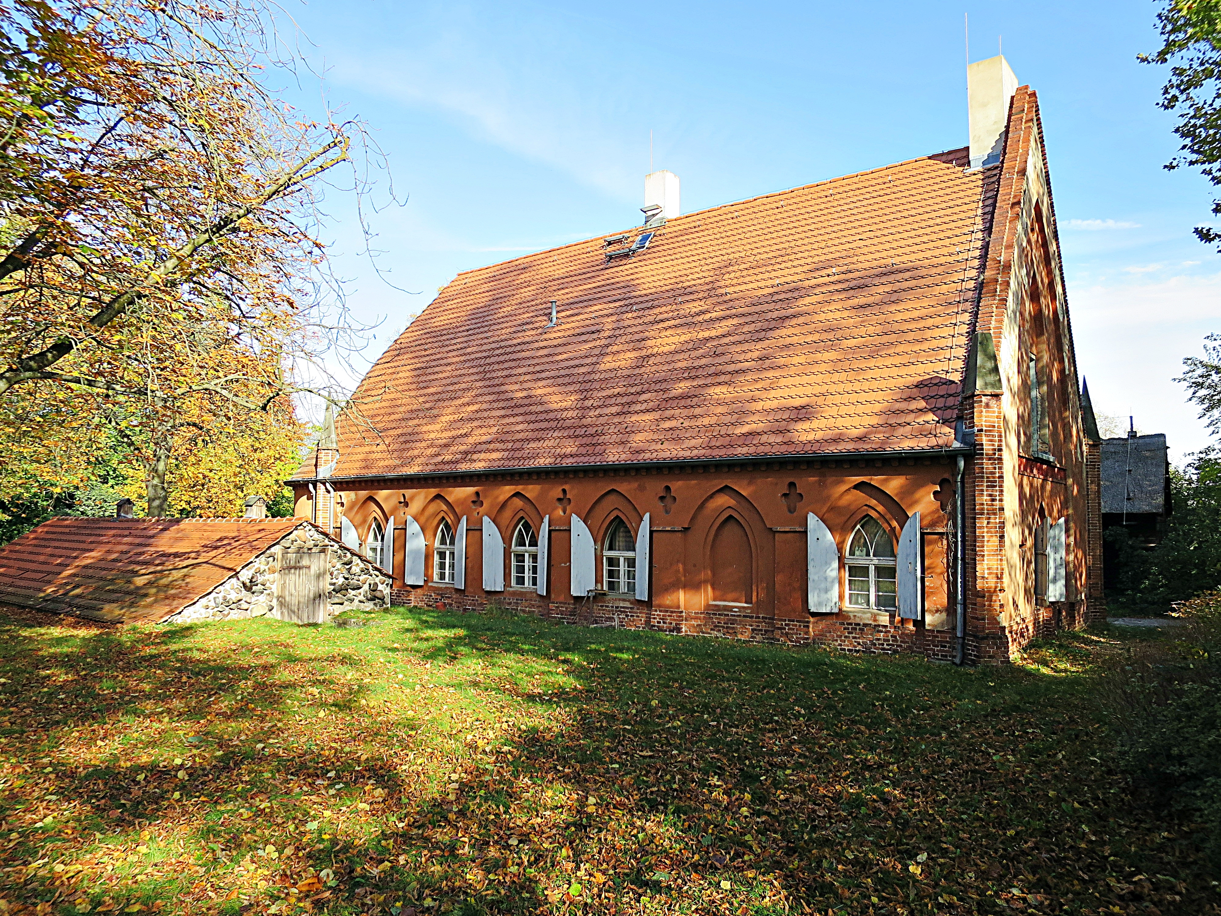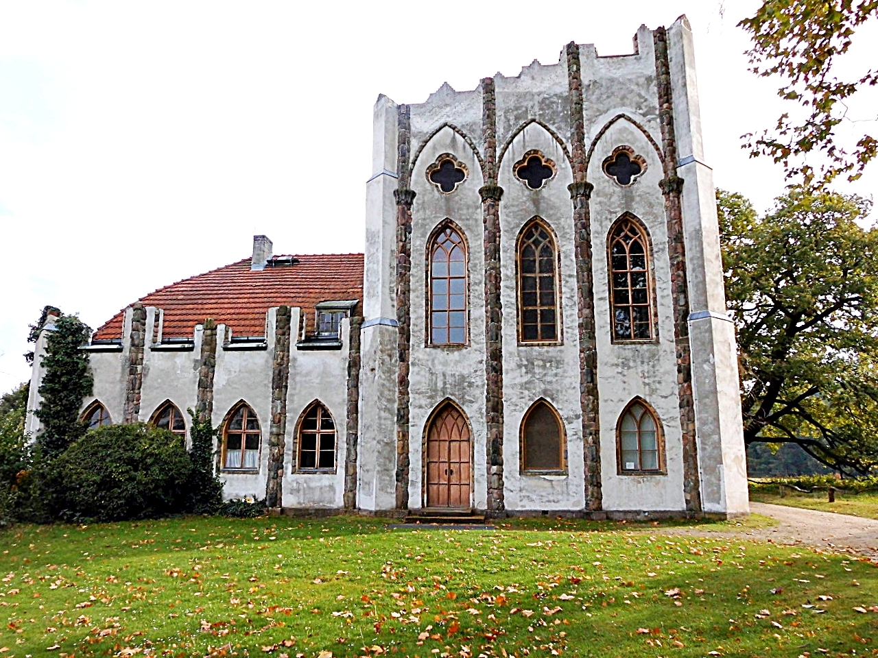 Die Meierei – die Molkerei - im Übersichtsplan Punkt 19 -. Auch hier die gotische Anmutung, ergänzt mit absichtlichen groben Spuren vermeintlichen Verfalls. Sie sollen uns die Vergänglichkeit allen Seins vor Augen führen und uns an Demut bei all' unserem kurzlebigen Tun gemahnen, selbst wenn dieses auch 'mal mit Kurzweil und Frohsinn gepaart wird.