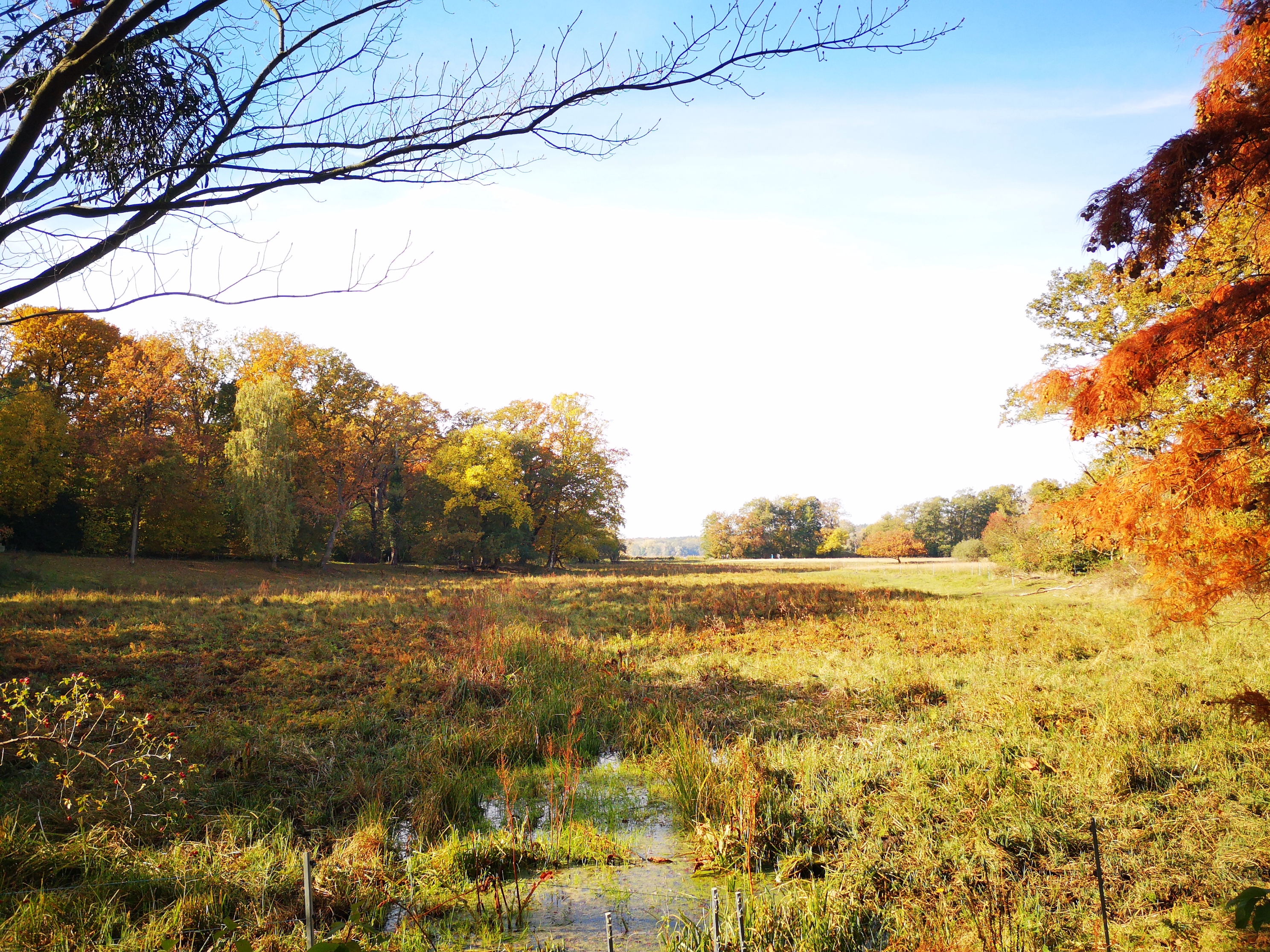 Ein Graben teilte die Inseloberfläche in früherer Zeit stärker in den kleinen Nord- und einen großen Südteil, „Hechtgraben“ genannt. Die noch bestehende Rinne hält die Wiesen zuweilen recht feucht, was sumpfliebendes Getier zum Laichen anregt – ein feucht-fröhlicher Lebensraum. Das Bild zeigt den weitläufigen Inselteil, von Norden nach Süden blickend ... - im Übersichtsplan Punkt 22 -.