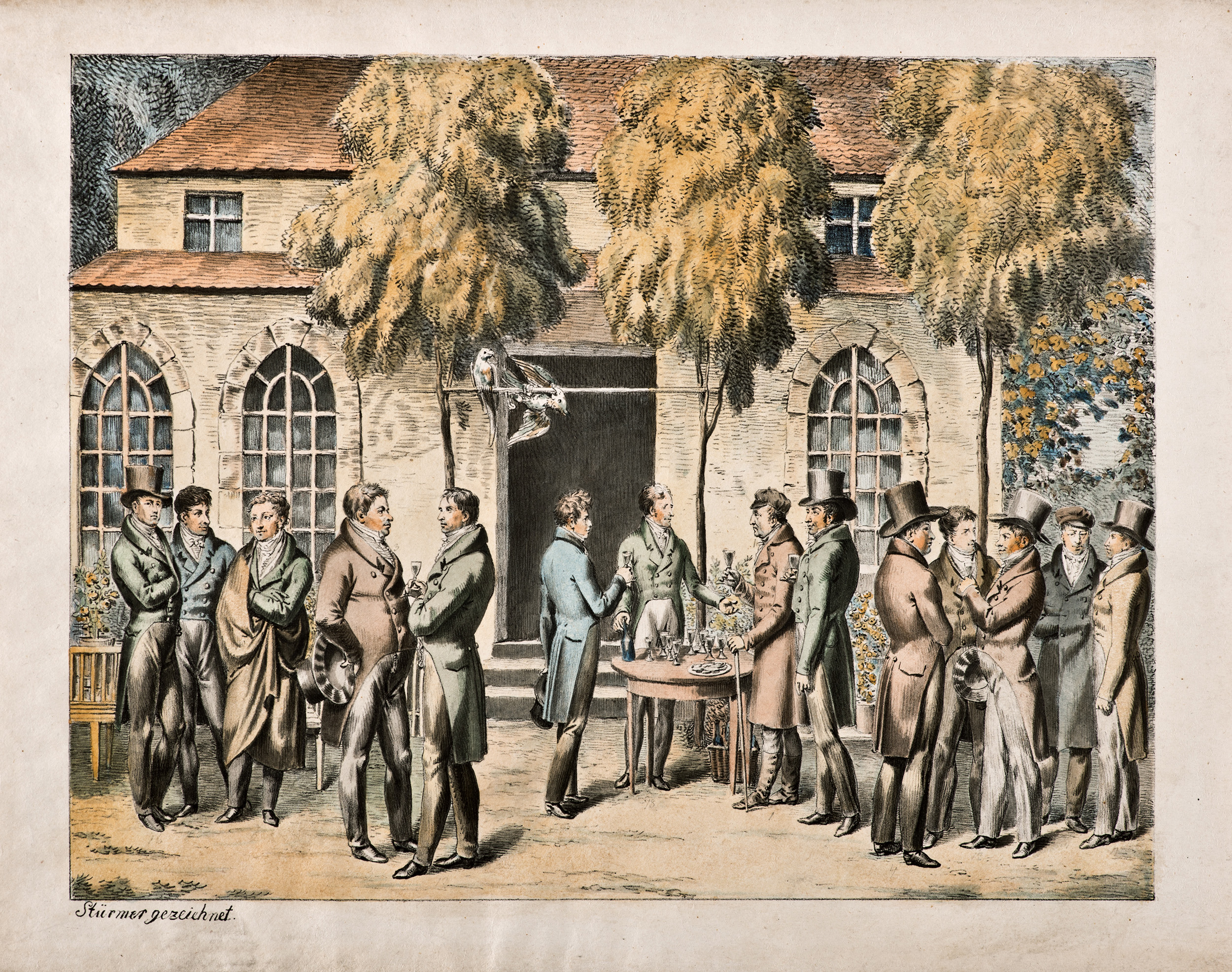 Die Darstellung des Kunstmalers Johann Heinrich Stürmer (1774–1855 ...oder auch... 1775–1857) zeigt Künstler während eines Empfangs im Jahre 1825 durch den Hofgärtner Ferdinand Fintelmann. Von links nach rechts sind zu erkennen: die Herren Jügel, Rungenhagen und Kolbe, sodann der Kassierer Wittich und der Modellmeister der KPM*, Riese. Am Tisch stehend Ottmer, als Gastgeber F. Fintelmann, ihm gegenüber Schadow und der Medailleur Jachtmann. Daneben folgen Brandt, Riese jun. und Berger, am rechten Bildrand Tangermann und Mauch. * KPM: Königlich-Preußische Porzellan-Manufaktur. Bildnachweis: Heinrich Stürmer, Berliner Künstler vor dem Gärtnerhaus auf der Pfaueninsel, Potsdam 1825, Kolorierte Lithographie; 27,20 cm x 36,20 cm, Inv.-Nr.: GDR 71/11, © Stiftung Stadtmuseum Berlin, Repro.: Oliver Ziebe, Berlin.