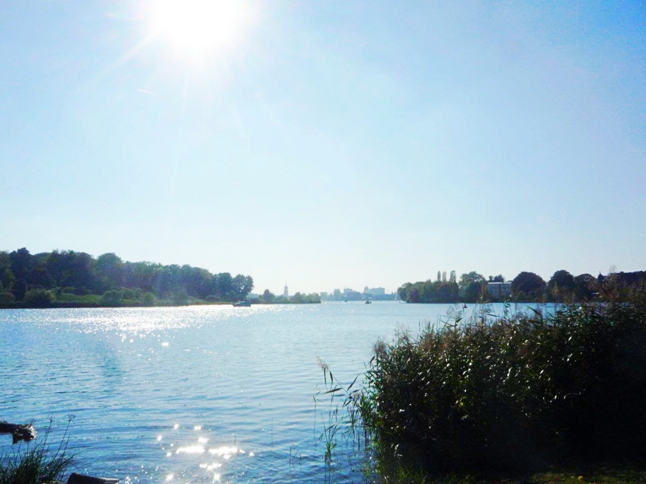 Nun stellen wir unsere Pupillen bitte wieder auf das Fernsehen ein und lassen unserer Augen Blick über die Havel zur Silhouette von Potsdam gleiten. So weit haben wir uns heute schon vom sonst üblichen geschäftigen Treiben der Gegenwart entfernt!