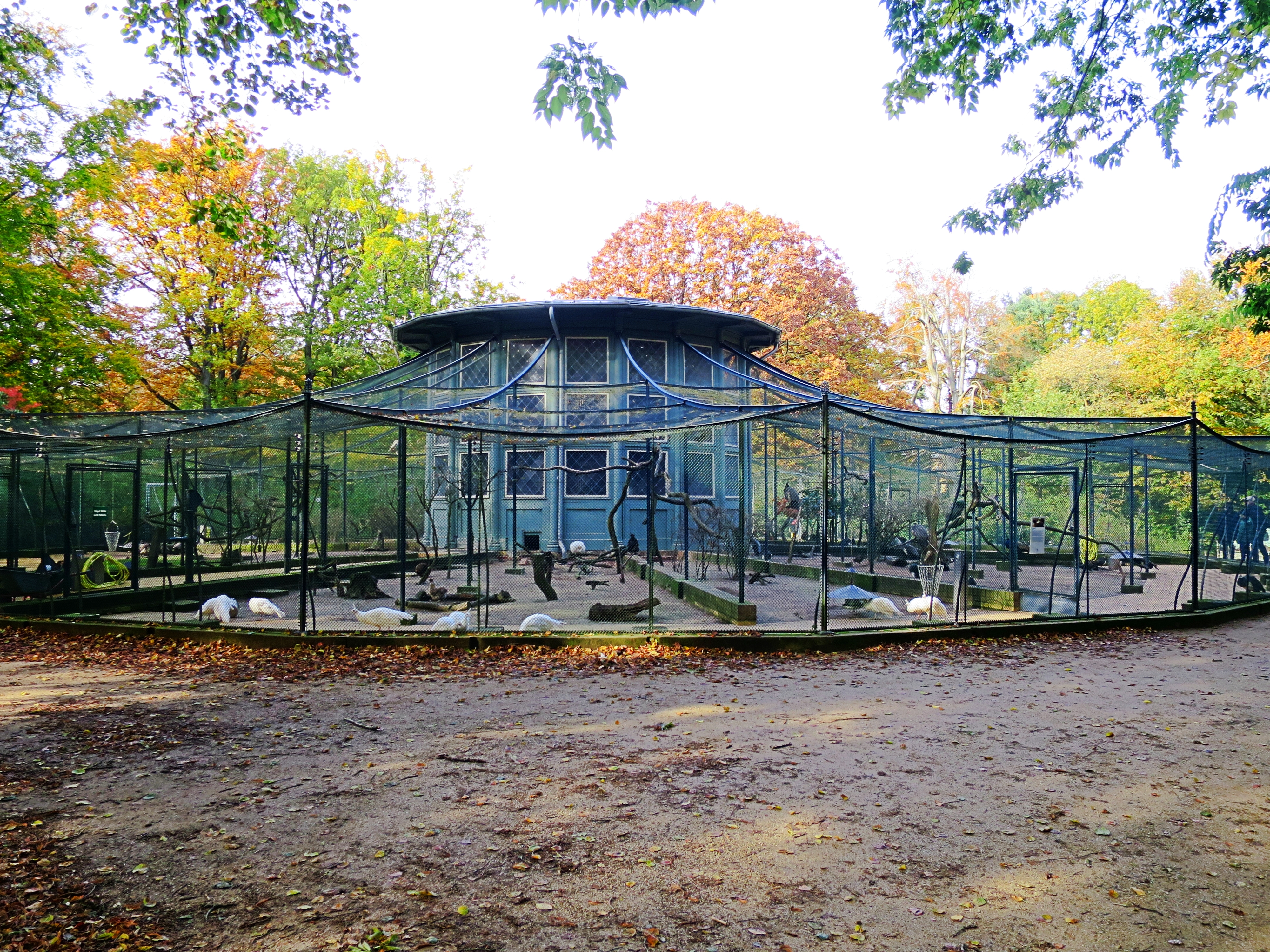 Die große Voliere – das Schaugehege für Pfauen, Fasane, Hühner und Maschenschlüpfer - im Übersichtsplan Punkt 13 -. Es ist der verbliebene Rest der ursprünglichen Menagerie, zu der zeitweilig mehr als 850 Tiere gehörten, darunter auch Kängurus, ein Löwe, der Bär, Lamas usw. usf. Bei der Auflösung der Insel-Menagerie bildete jener Tierbestand den Grundstock für den neuen Berliner Zo-ologischen Garten, der 1844 seine Pforten dem Volke öffnet.