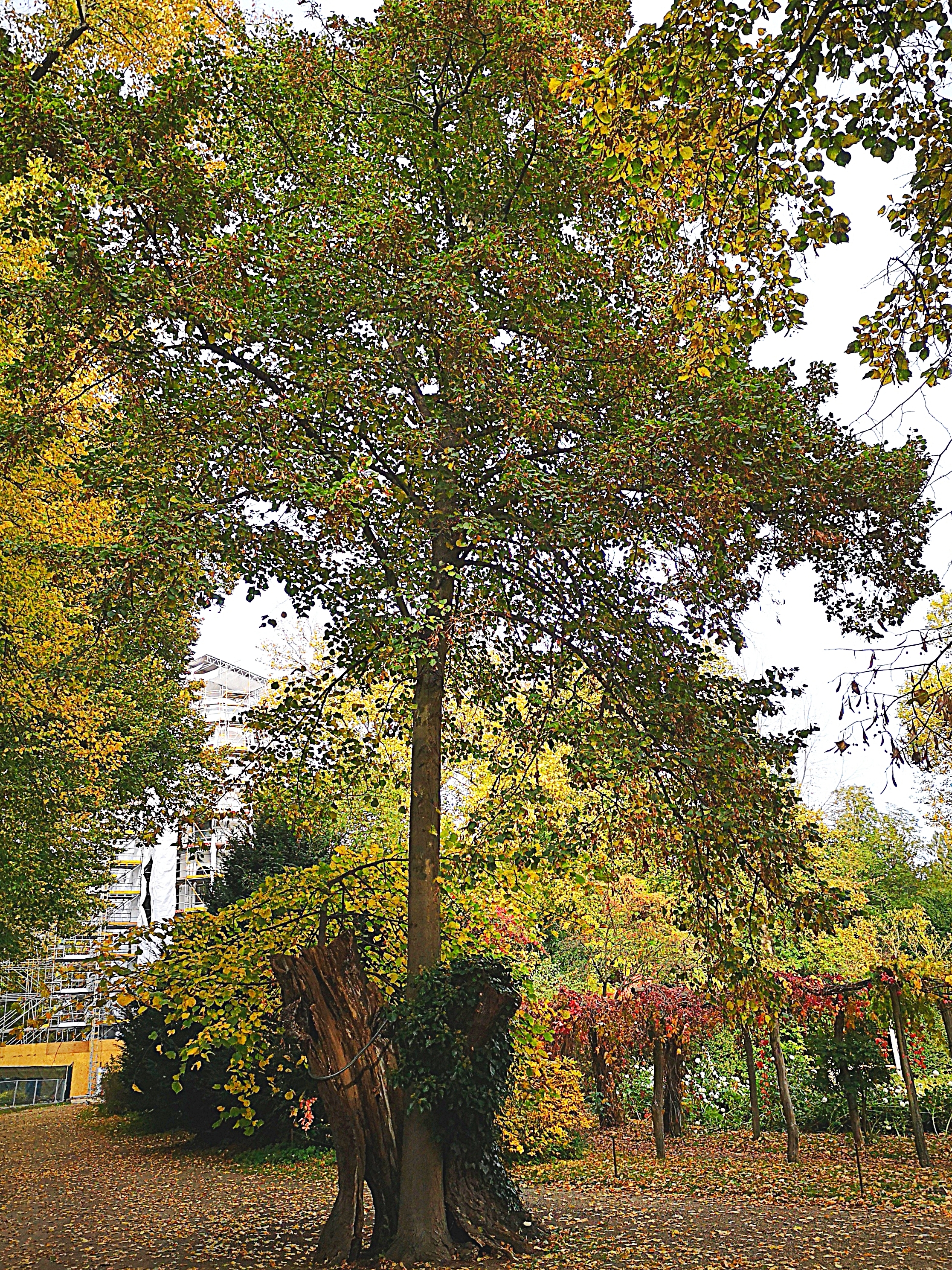 Aus dem übermüdeten bröckeligen Alten spross der junge saftige Trieb einer immer größer werdenden Linde - im Übersichtsplan Punkt 07 -. Im Hintergrund: Hätten Christo und Jeanne-Claude das doch noch miterleben dürfen – die Langzeit-Verhüllung eines echt Königlichen und ziemlich märchenhaften Schlosses (2021 bis eventuell 2024) ... löst aber bei manch einem Besucher Bedauern aus.