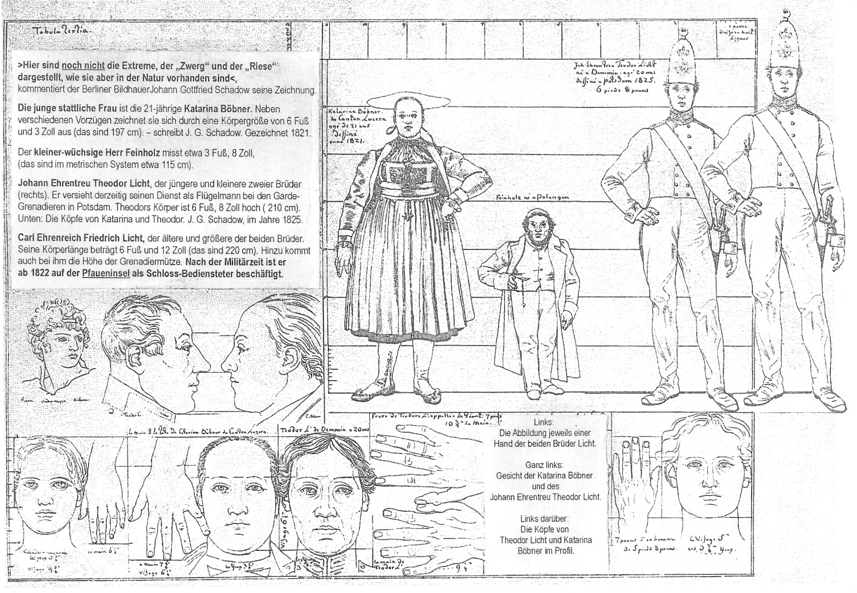 Dem jeweiligen Monarchen war es angenehm, auf der Insel auch einige Menschen weniger alltäglichen Erscheinungsbildes oder wegen einer außergewöhnlicher Profession, als „Exoten“, siedeln zu lassen. Zu diesen gehörten: - Meister Johann(es) Kunckel (um 1630–1703). Jenen kennen wir ja schon. - die kleinere Marie Strakonn (der Familienname hier in der Schreibweise des Standesamtes, wahlweise auch Strakon oder gar Strakow geschrieben). Geboren in Böhmisch-Rixdorf 1805. Gestorben auf der Pfauen-Insel im Jahre 1878, als 72-jährige „Schlossjungfer“, etwa 1.26 m ihrer äußeren Größe messend. - der Hawaiianer „Henry / Harry Maitey“, mit den späteren preußischen Vornamen Heinrich Wilhelm (1807–1872) und - der großwüchsige Carl Ehrenreich Friedrich Licht (1797–1834), 2,20 m groß, bald ein Schlossbediensteter. Zum Bild: Neben weiteren Nicht-Insulanern, die dem Johann Gottfried Schadow zum exakten Größenvergleich als Modell dienten, sehen wir rechts außen die Gebrüder Carl Ehrenreich Friedrich Licht (1797–1834). Wir sehen den großen, nebst seinem etwas kleineren und jüngeren Bruder Johann Ehrentreu Theodor Licht (1804–1834), die beide aus Utzedel bei Demmin in Pommern als Söhne eines Ziegelbrenners und seiner lieben Frau stammen. Beide leisten ihre Militärzeit als Königliche Garde-Grenadiere in Potsdam. Bildnachweis: Schadow. Entstehungszeit der zusammengestellten Skizzen 1823 ... 1825, im „Polyclet oder Von den Maassen des Menschen“, Berlin 1834, gemeinfrei. Die aufgelegten Erläuterungstexte decken lediglich hier temporär einige Kopfskizzen von „Fremdpersonen“ ab, die beim Original natürlich erhalten geblieben sind.