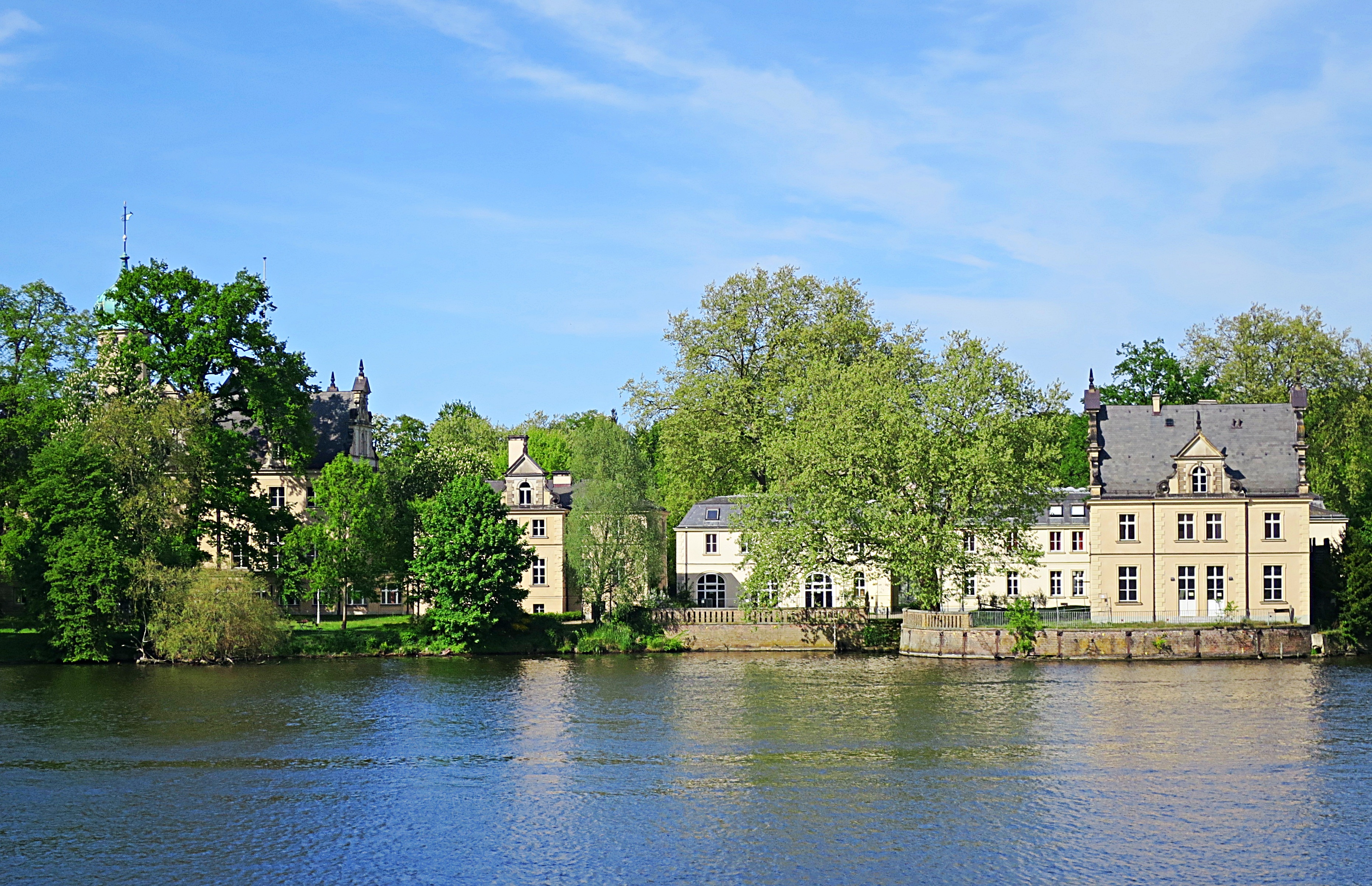 Nur wenige Schritte weiter blicken wir über die Große Schlosswiese zu dem prächtigen, blendend weißen Kleinod hinüber.