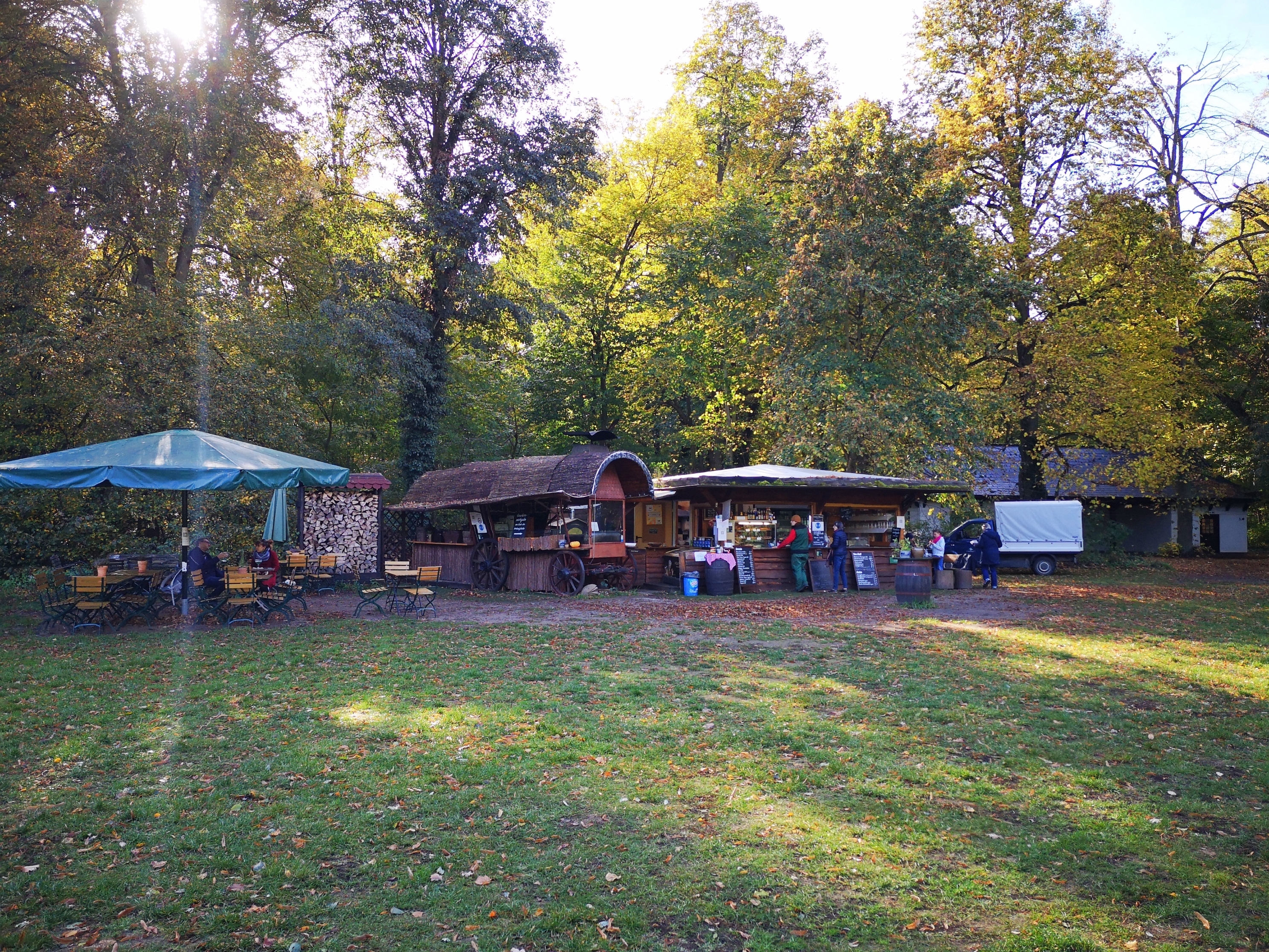 Am Rande der Liegewiese, möglicher Weise im Zentrum des Interesses, finden wir den „Kaffeegarten“ mit Imbissangebot (gilt als das 4. „Wirtshaus“). Gönnen wir uns also ein „Köppchen“ (siehe oben – bei der Kunst des Kunckels). Rechts hinten die Besuchertoiletten (Nr. 2).