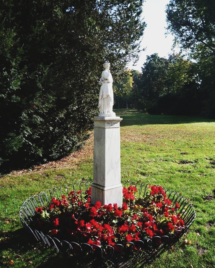 1852 brilliert hier auf dem Rasenplatz hinter dem Schlösschen die glückliche Schauspielerin Elisabeth Rachel Felix mit ihrer Gabe und Leistung vor den Familien des preußischen Königs, des russischen Zaren und dem Gefolge. Ihr zu Ehren und als Erinnerung an diesen denkwürdigen Tag wurde eine Stele mit ihrer Figur gearbeitet und hinter dem Schlösschen aufgestellt – ein liebes teures Gedenken an ausgefüllte gehaltvolle Stunden - im Übersichtsplan Punkt 06 -.