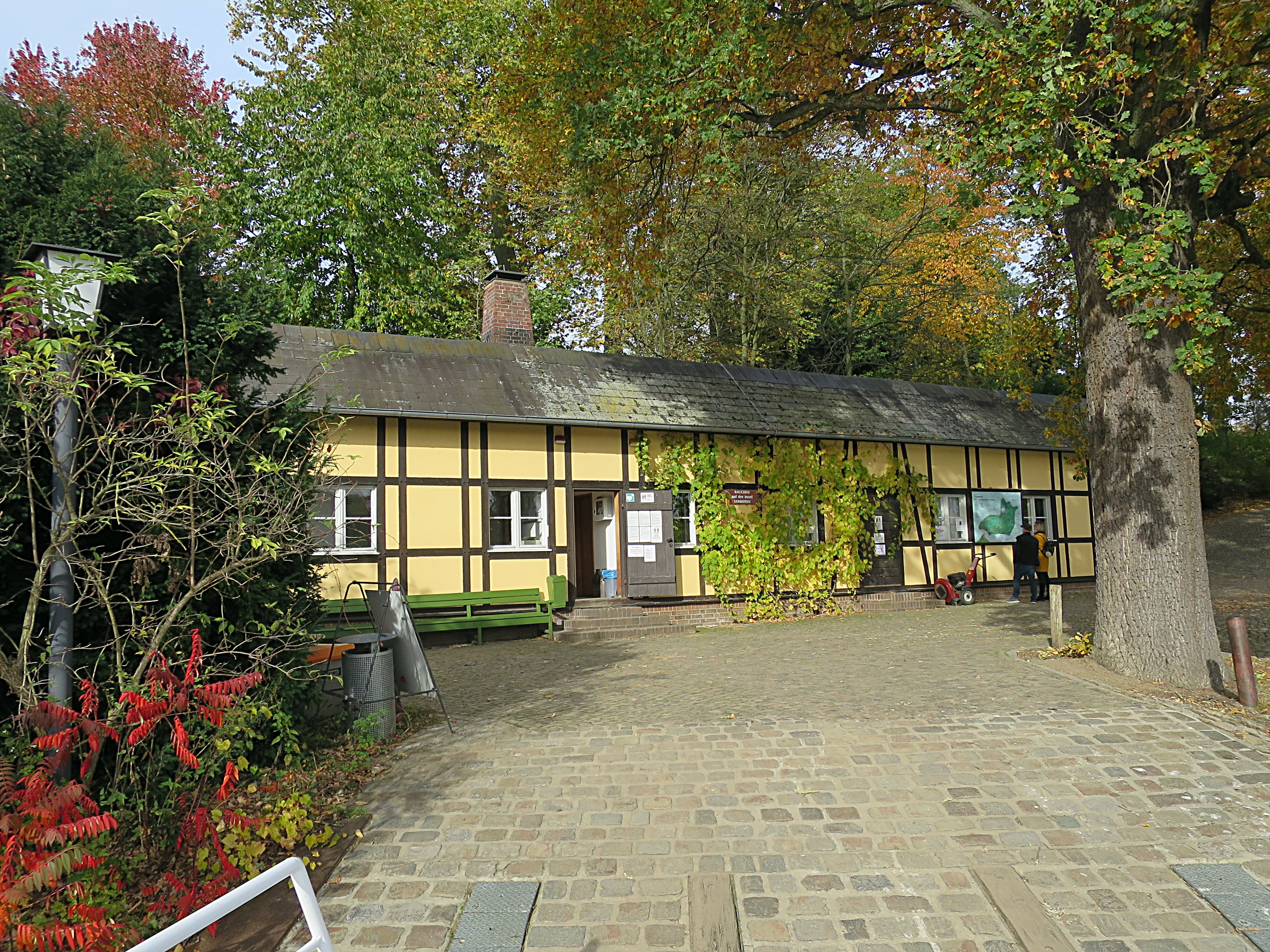 Das Fährmann-Haus – im Übersichtsplan Nr. 03. Zeitgenössisch nannte man das Gebäude auch das „Überfahrer-Haus“. Wollen wir uns nur Gutes dabei denken. Hinab geht es zum Ufer, wo die Fähre auf uns wartet. Müssen aber wir mal auf die Fähre warten, so lädt uns dort das Wirtshaus (3. Gastwirtschaft) ein, um die Wartezeit zu kürzen oder auch länger dort zu weilen. Eventuell mitgebrachte eigene Tiere (z. B. Katzen, Hunde, Pferde) werden mit der Fähre nicht befördert, weil jene auf der Insel nichts verloren haben. Sie müssen auf dem Festland und möglichst in Obhut bleiben. Ausnahmen gibt es für Begleithunde sehgeschädigter Mitbürger. Die Fährfahrt ist dann eine kurze, ohne jedwede Gefährnisse. Im nur scheinbar höheren Fahrpreis ist das Inseleintrittsgeld versteckt. Nach dem Anlanden begrüßt uns auf der Insel das Fährmann-Haus mit dem Besucher-Dienst / Museums-Laden und rechts davon das separate Toilettengebäude Nr. 1.