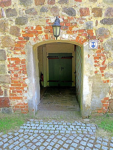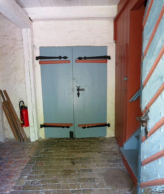 Wir betreten die sakrale Stätte, indem wir unter dem Turm hindurch schreiten. Dieser ist als ein so genannter Dachreiter ausgebildet, also nicht massiv auf einem Fundament gegründet. Geradezu gehen wir durch die geöffnete Eingangstür ins Kirchenschiff. Links (außerhalb des Bildes), befindet sich der frühere Abstellort für die „Todten-Baaren“. Rechts führt eine Treppe hoch zur Orgel-Empore, zu den Zug-Enden (oder Tampen) der langen Taue für die Glockenbedienung und eine Treppe höher dann zu den Glocken. Die Kirche ist mit drei Glocken in den Durchmesser-Größen von 113 cm, 90 cm und 76 cm bestückt.